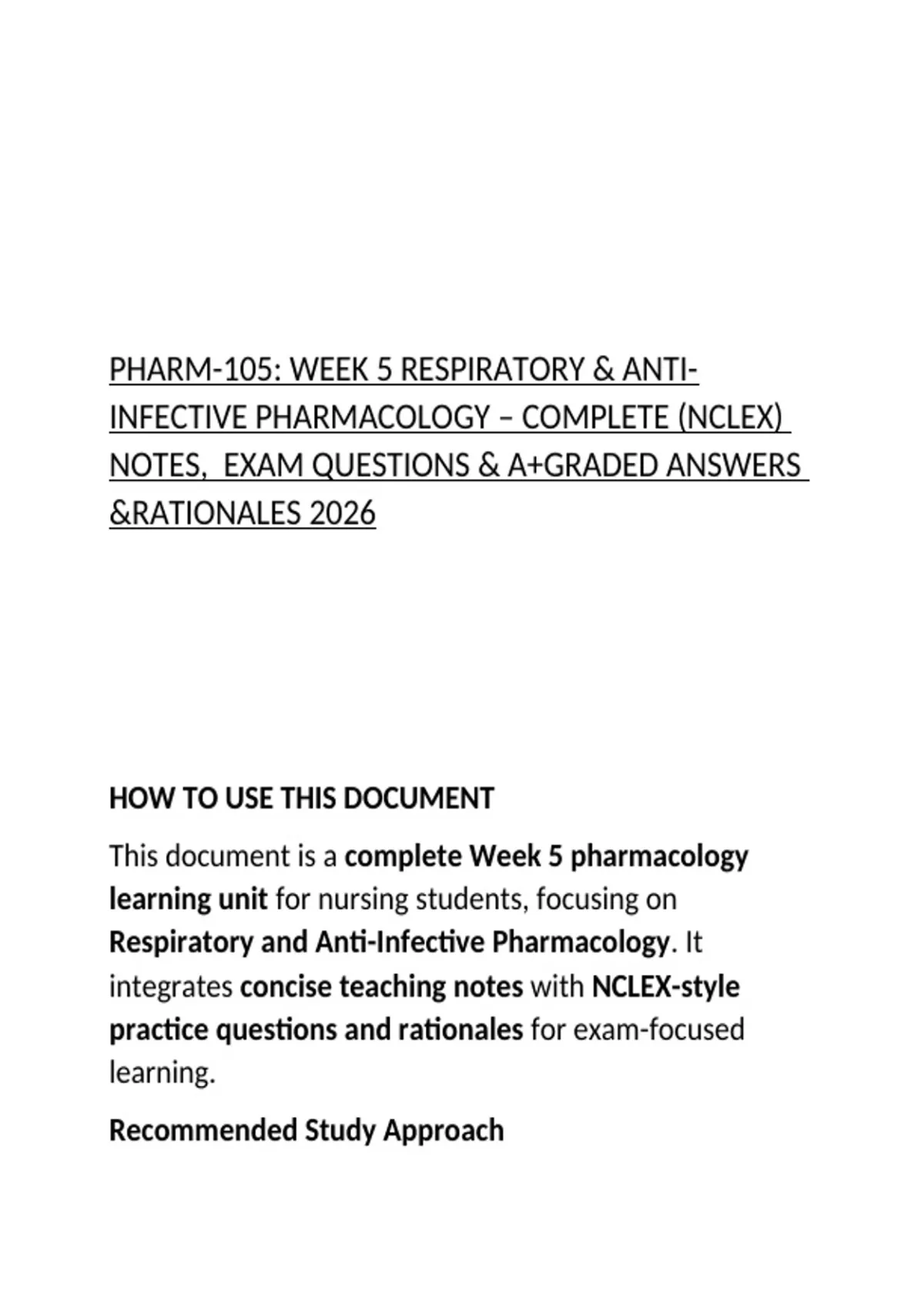 PHARM-105: WEEK 5 RESPIRATORY & ANTI-INFECTIVE PHARMACOLOGY – COMPLETE (NCLEX) NOTES, EXAM QUESTIONS & A+GRADED ANSWERS &RATIONALES 2026