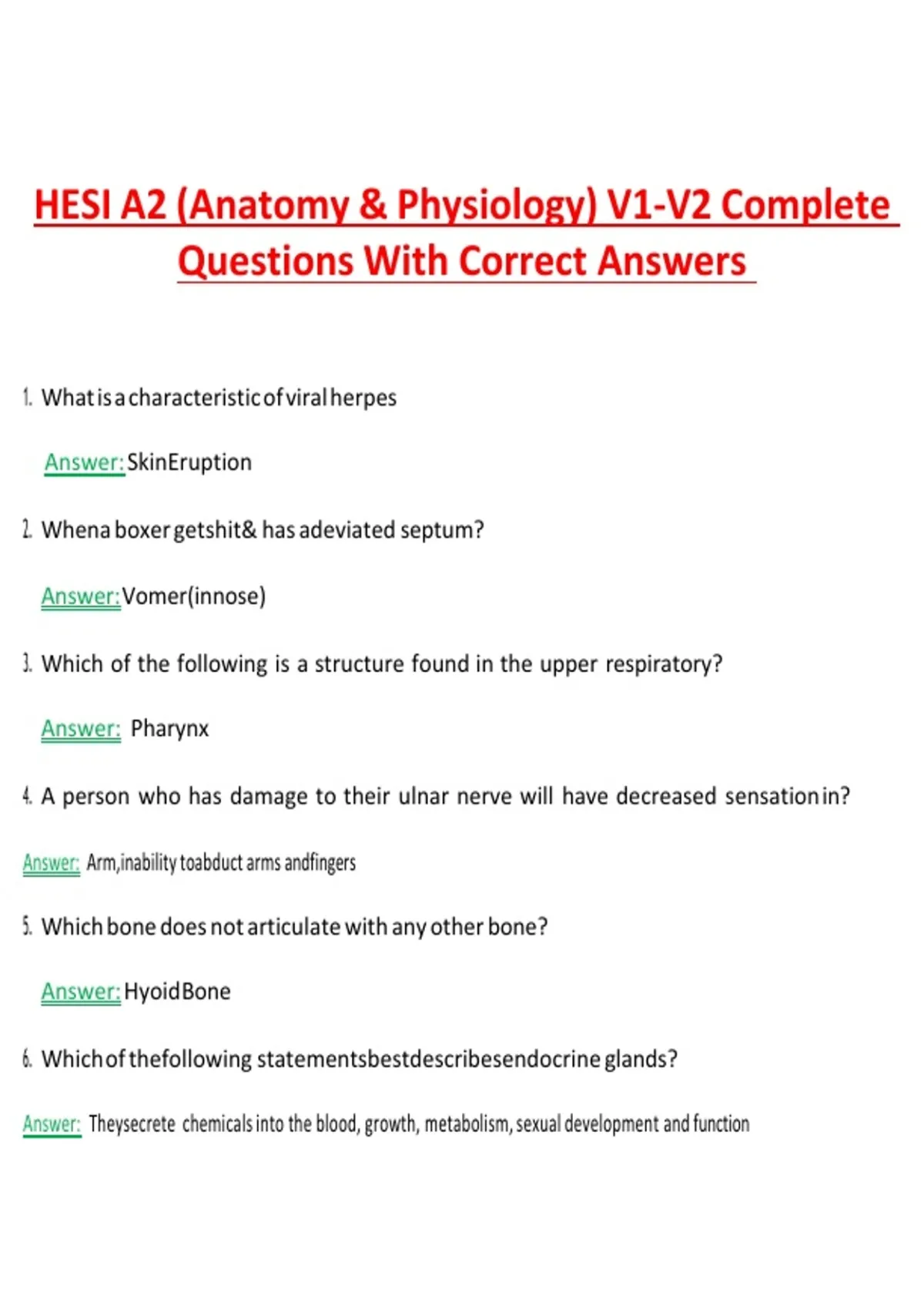 HESI A2 (Anatomy & Physiology) V1-V2 Complete