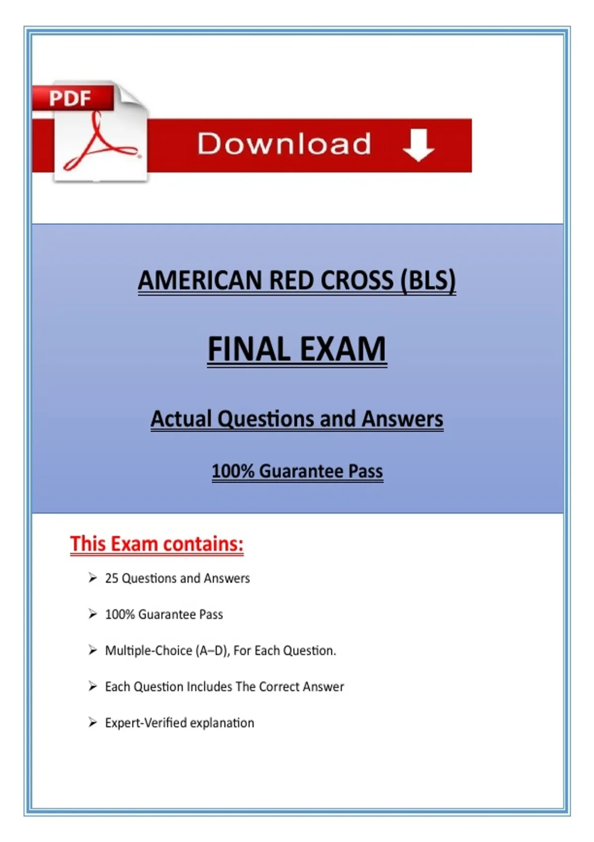 American Red Cross BLS Final Exam – 2026 | Actual Questions & Answers | 100% Pass Guarantee Prepare with confidence for the American Red Cross Basic Life Support (BLS) Final Exam using this Instant PDF Download, created for healthcare providers, students, and professionals seeking efficient and reliable exam preparation. This study guide includes actual-style exam questions with accurate answers, clear explanations, and focused review of critical BLS concepts such as CPR techniques, AED use, adult/child/infant resuscitation, airway management, and team dynamics. Ideal for full review or last-minute study. What You’ll Receive: Actual-style BLS exam questions and answers Clear explanations for rapid understanding Covers essential American Red Cross BLS protocols Instant PDF download – study immediately Printable and mobile-friendly format American Red Cross BLS Final Exam BLS exam questions and answers Basic Life Support exam prep Red Cross BLS study guide BLS practice test PDF BLS certification exam prep CPR AED exam questions Healthcare BLS test prep Printable BLS exam BLS final exam review Red Cross BLS practice questions Instant BLS exam PDF BLS life support study guide CPR certification exam prep BLS 100% pass guarantee guide