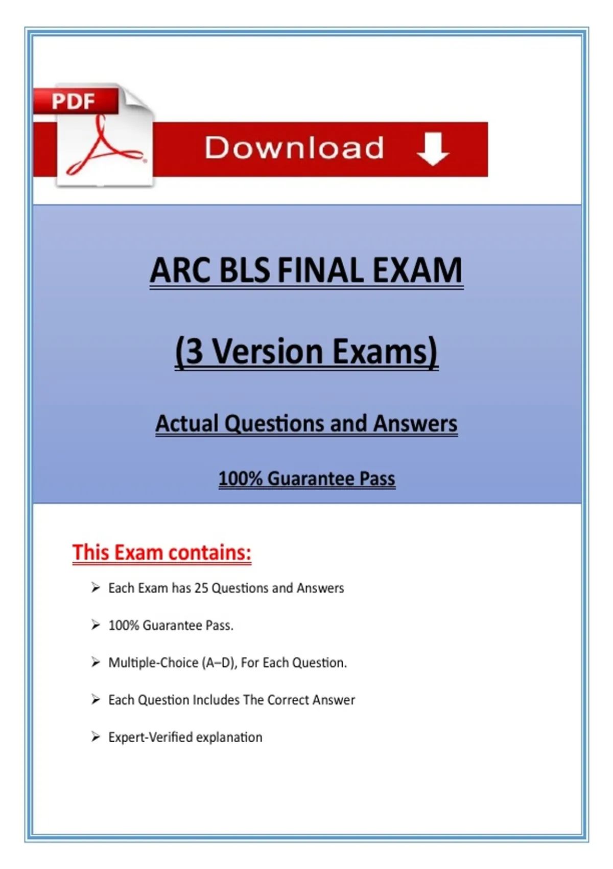 American Red Cross BLS Final Exam (3 Versions) –2026 | Questions with 100% Correct Answers Complete | Updated 2026 / 2027 Verified by Experts Prepare with confidence for the American Red Cross Basic Life Support (BLS) Final Exam using this Instant PDF Download, featuring three complete exam versions for thorough practice and mastery. This comprehensive study resource includes exam-style questions with accurate answers, clear explanations, and full coverage of essential BLS concepts such as CPR, AED use, adult/child/infant resuscitation, airway management, and team dynamics. Multiple versions help reinforce knowledge and improve test readiness. What You’ll Receive: 3 full BLS exam versions for realistic practice Exam-style questions with correct answers Covers core American Red Cross BLS protocols Instant PDF download – start studying immediately Printable and mobile-friendly format American Red Cross BLS Final Exam BLS Final Exam 3 Versions BLS practice exams PDF Basic Life Support exam prep Red Cross BLS study guide BLS exam questions and answers CPR AED exam prep Healthcare BLS test prep Printable BLS exams BLS certification exam review Red Cross BLS practice tests Instant BLS exam PDF BLS life support study guide CPR certification test prep BLS multiple exam versions