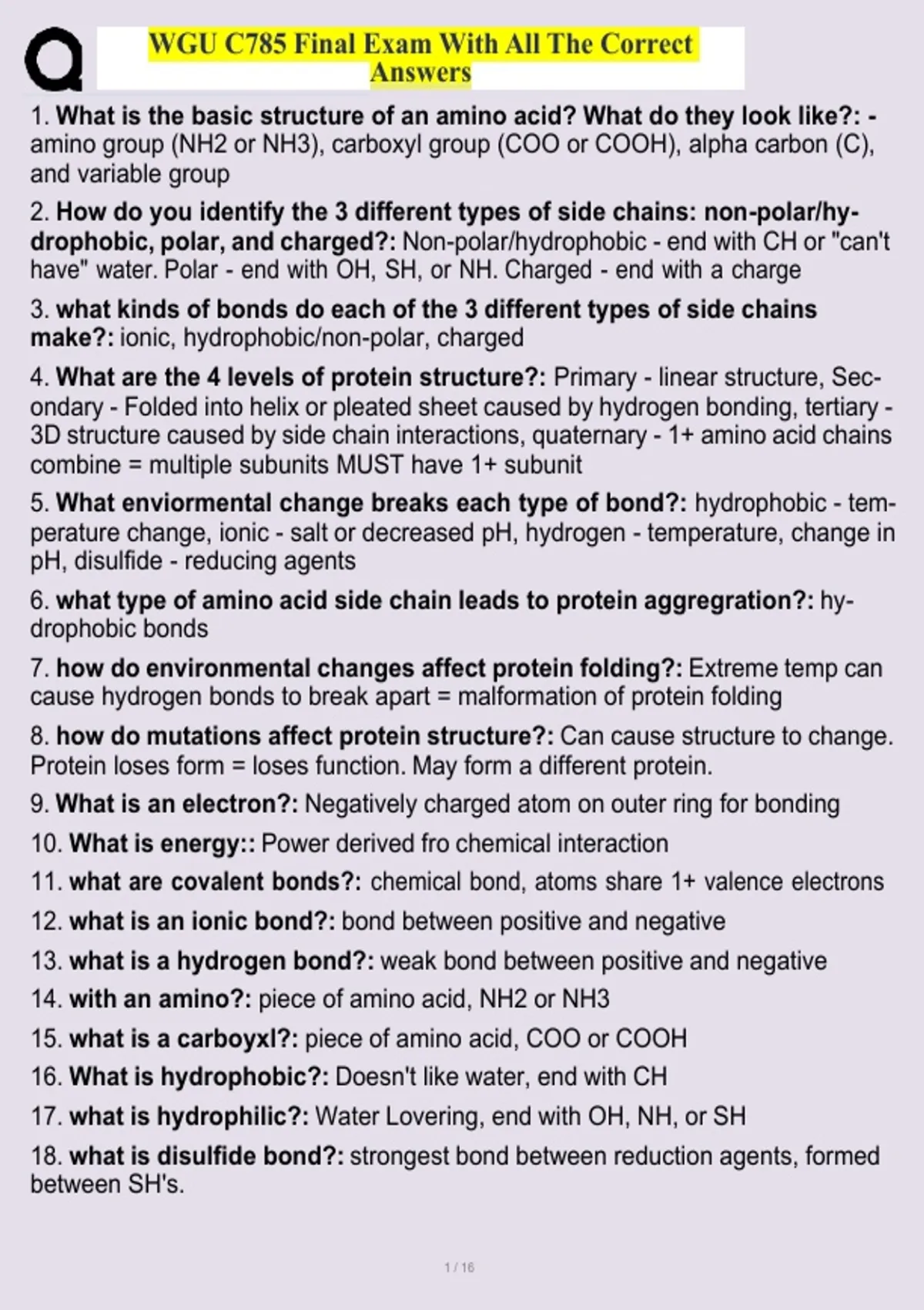 This document provides an extensive set of WGU C785 Biochemistry final exam questions paired with correct, clearly written answers. It covers core topics such as protein structure and folding, enzymes and inhibition, DNA and RNA processes, gene expression, metabolism, carbohydrates, lipids, cellular respiration, and hormonal regulation. The material is ideal for comprehensive exam preparation and as a full-course review aligned with the WGU C785 assessment.