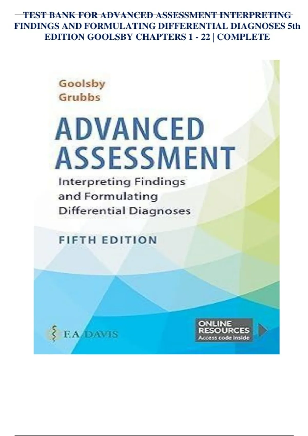 TEST BANK FOR ADVANCED ASSESSMENT INTERPRETING FINDINGS AND FORMULATING DIFFERENTIAL DIAGNOSES 5th EDITION GOOLSBY CHAPTERS 1 - 22 | COMPLETE