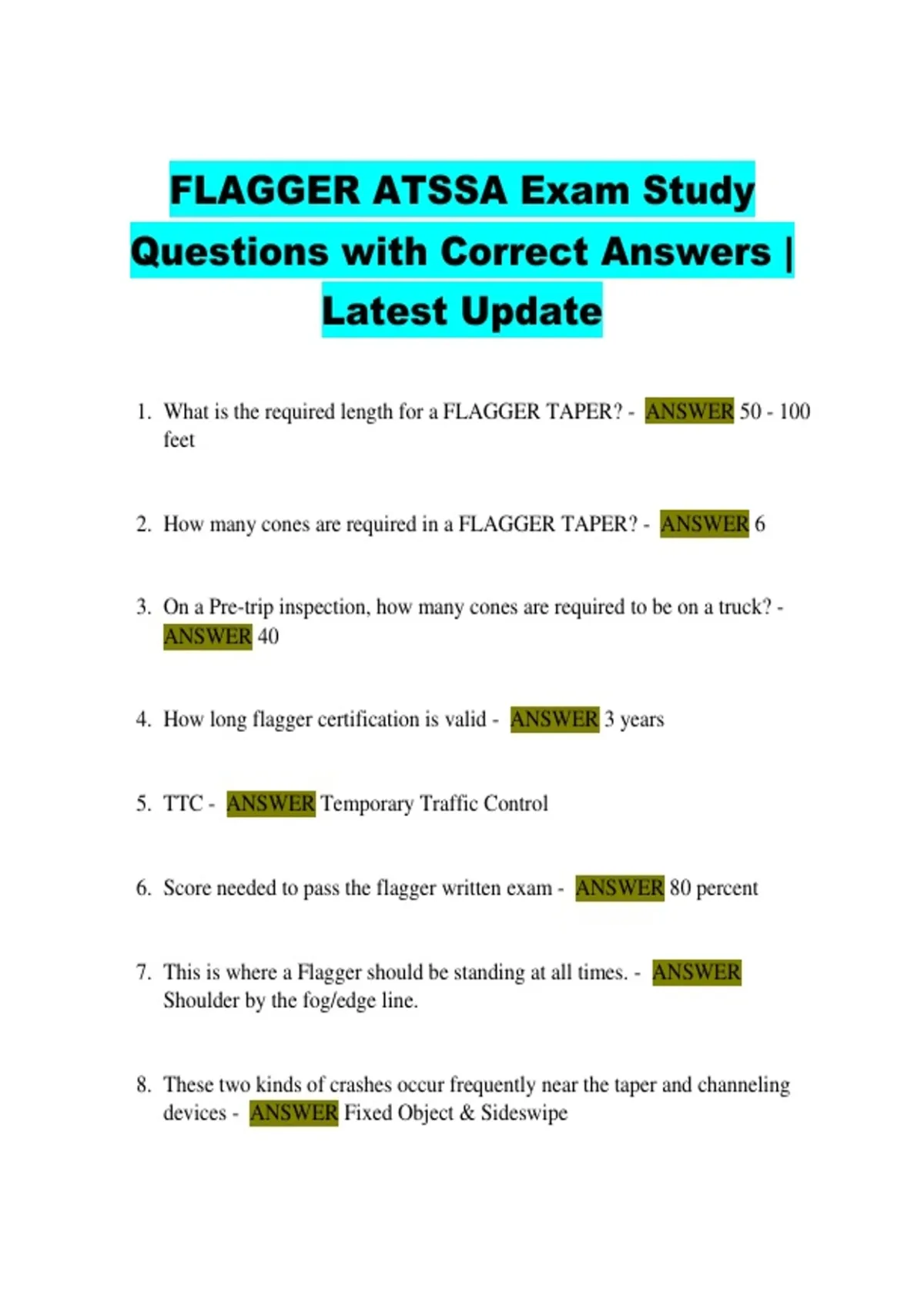 FLAGGER ATSSA Exam Study Questions with Correct Answers | Latest Update