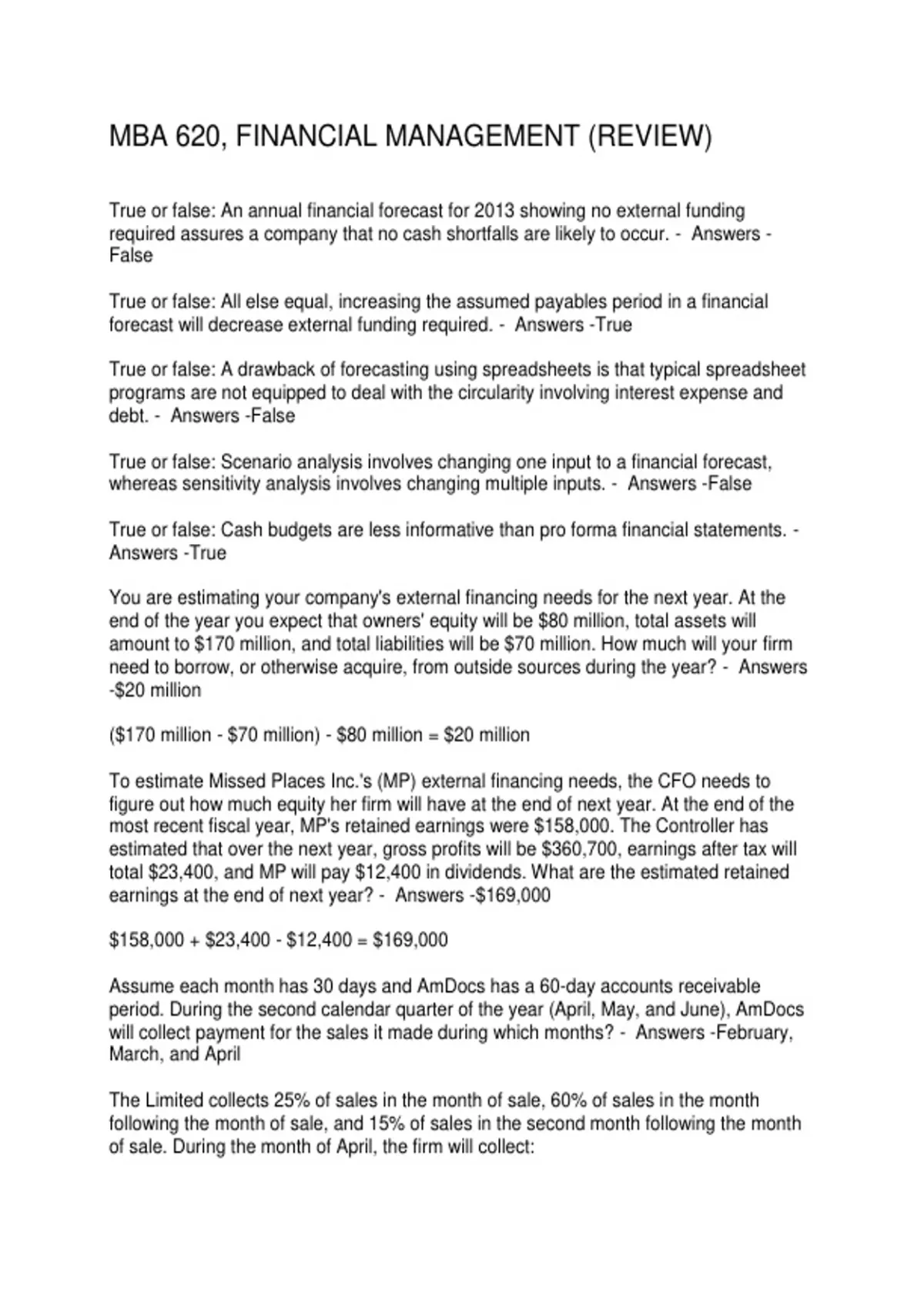 MBA 620, FINANCIAL MANAGEMENT (REVIEW)