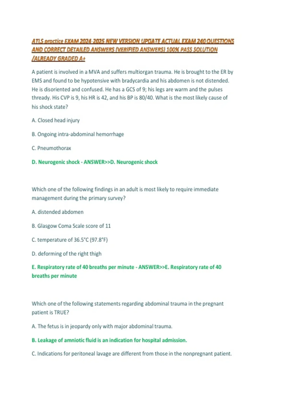 D. Neurogenic shock - ANSWER>>D. Neurogenic shock