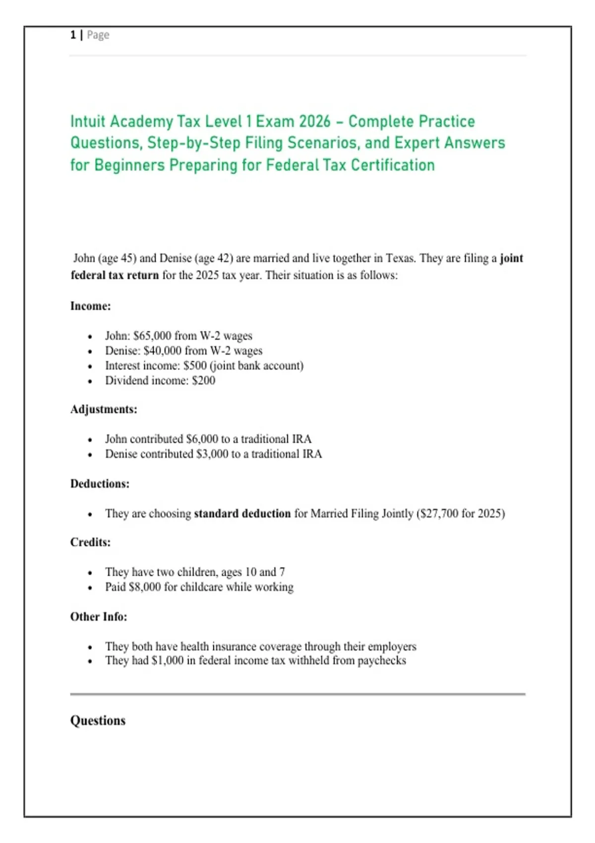 Intuit Academy Tax Level 1 Exam 2026 – Complete Practice Questions, Step-by-Step Filing Scenarios, and Expert Answers for Beginners Preparing for Federal Tax Certification