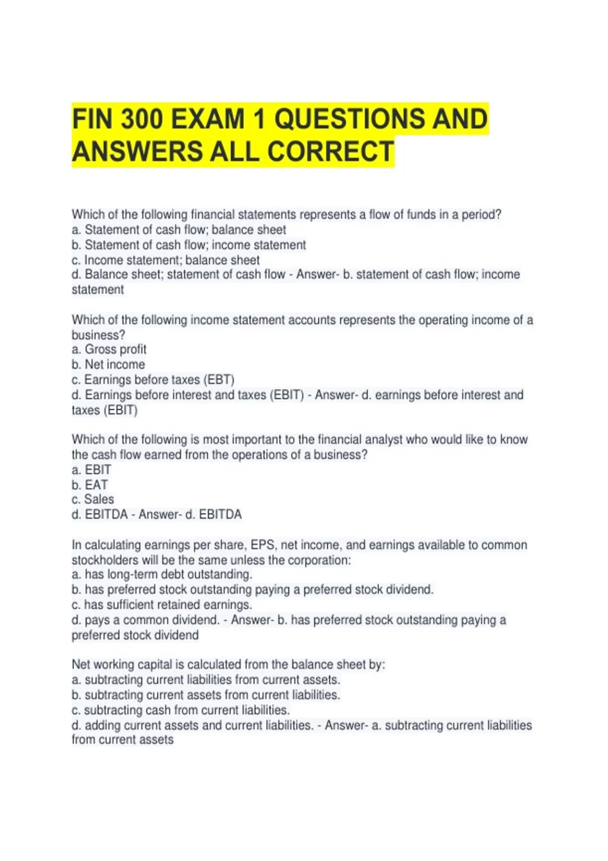 FIN 300 EXAM 1 QUESTIONS AND
