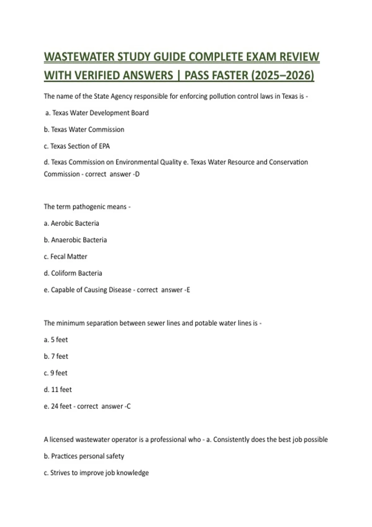 WASTEWATER STUDY GUIDE COMPLETE EXAM REVIEW WITH VERIFIED ANSWERS | PASS FASTER (2025–2026)