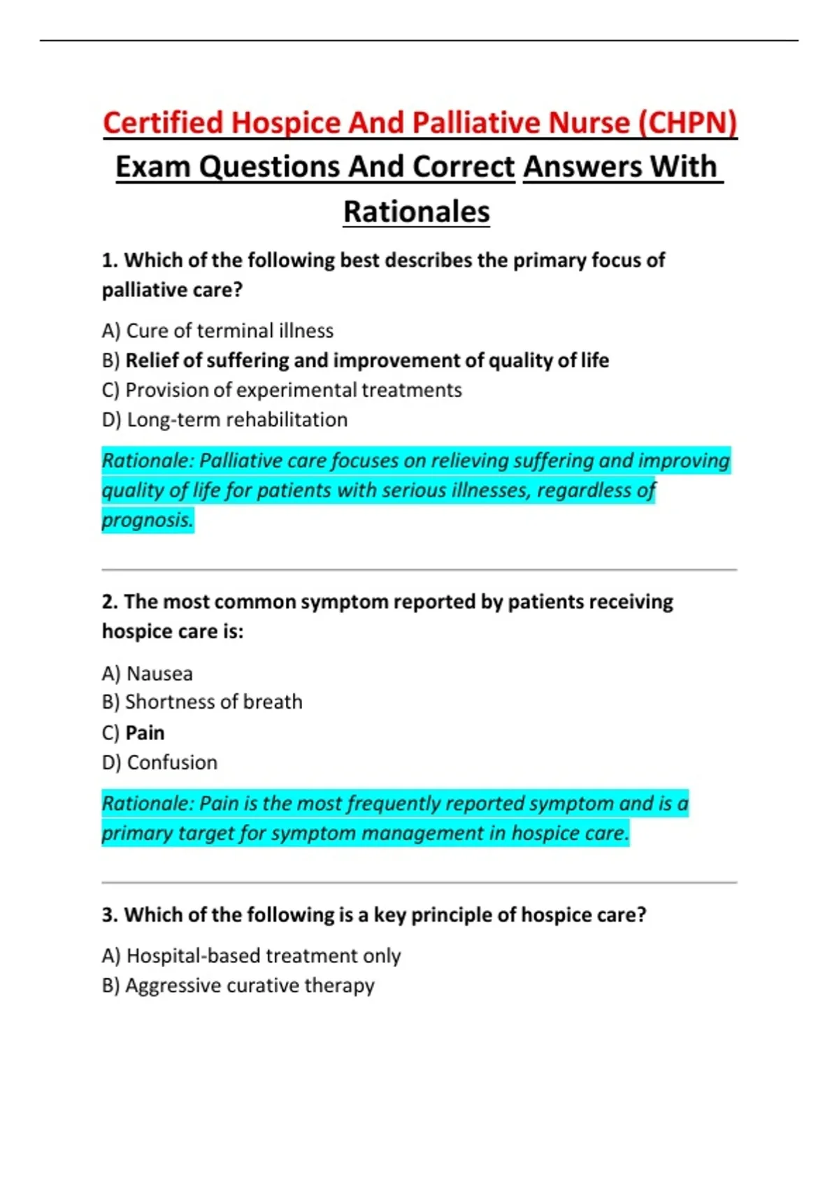 updated exam questions with correct answers and clear rationales for the Certified Hospice and Palliative Nurse (CHPN) certification exam. It thoroughly covers palliative and hospice care principles, pain and symptom management, ethical decision-making, psychosocial and spiritual support, end-of-life signs, interdisciplinary team roles, and communication strategies. The content is well-suited for structured exam preparation, self-assessment, and reinforcing evidence-based hospice and palliative nursing practice.