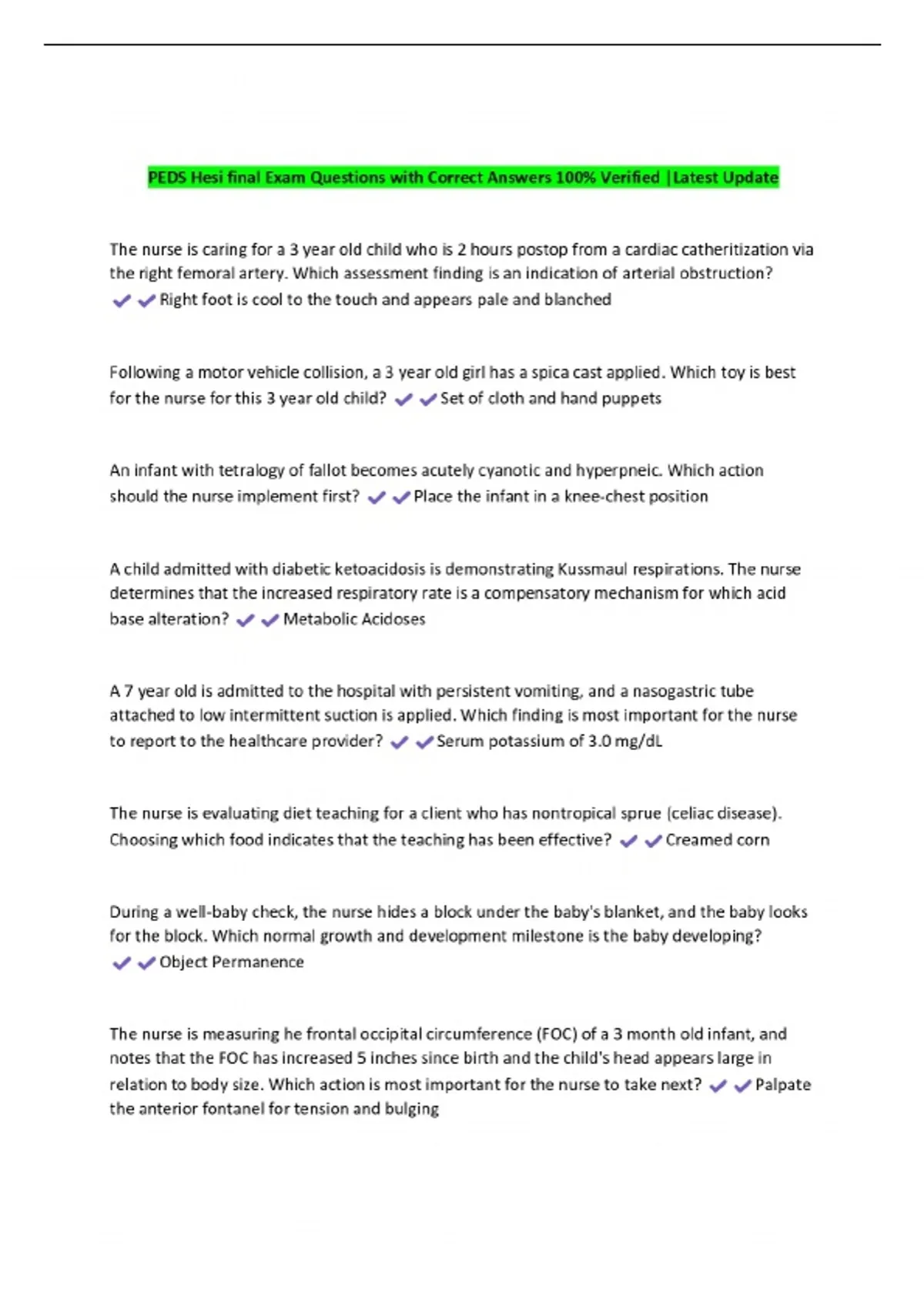 PEDS Hesi final Exam Questions with Correct Answers 100% Verified |Latest Update