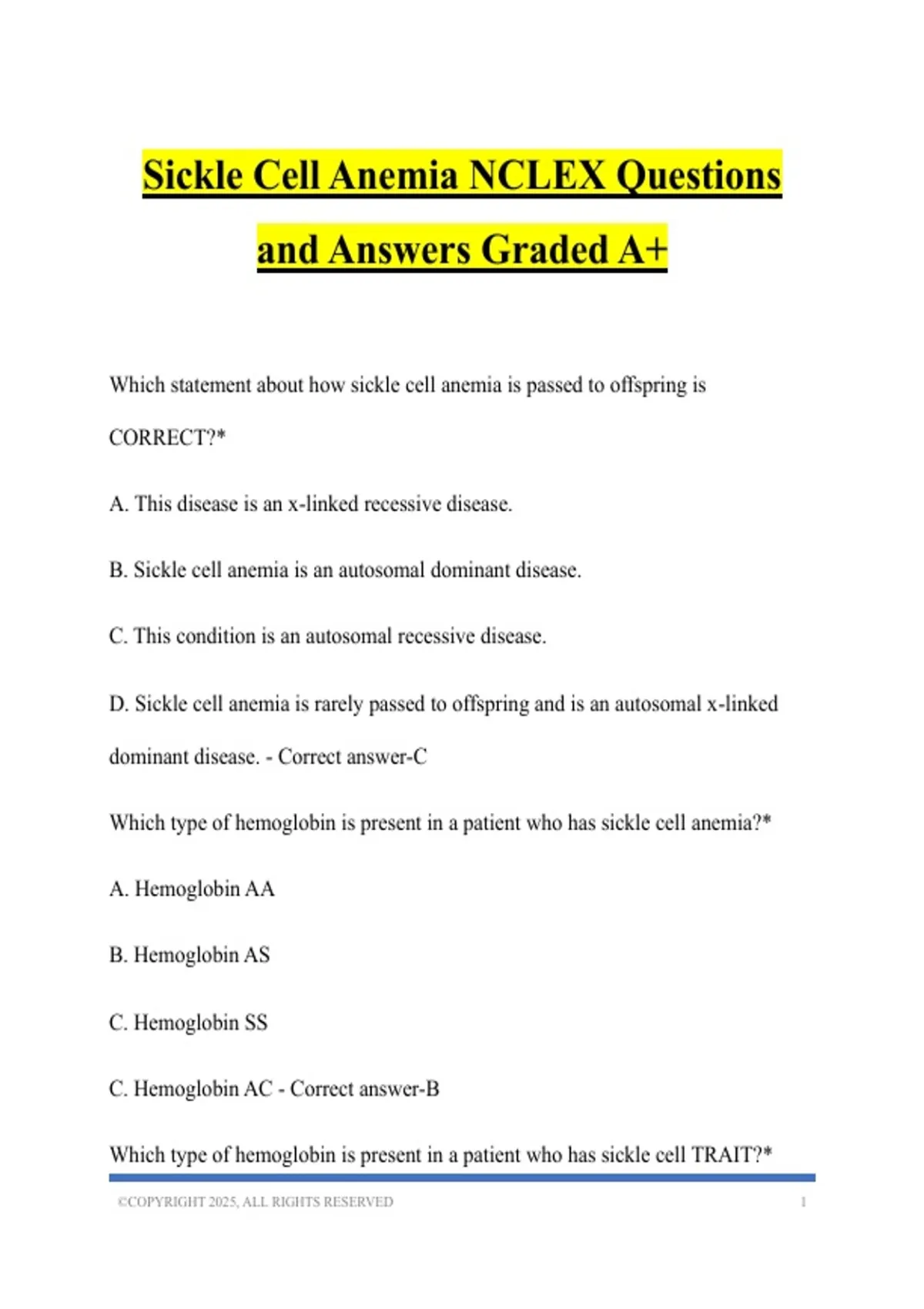 Sickle Cell Anemia NCLEX Questions and Answers Graded A+