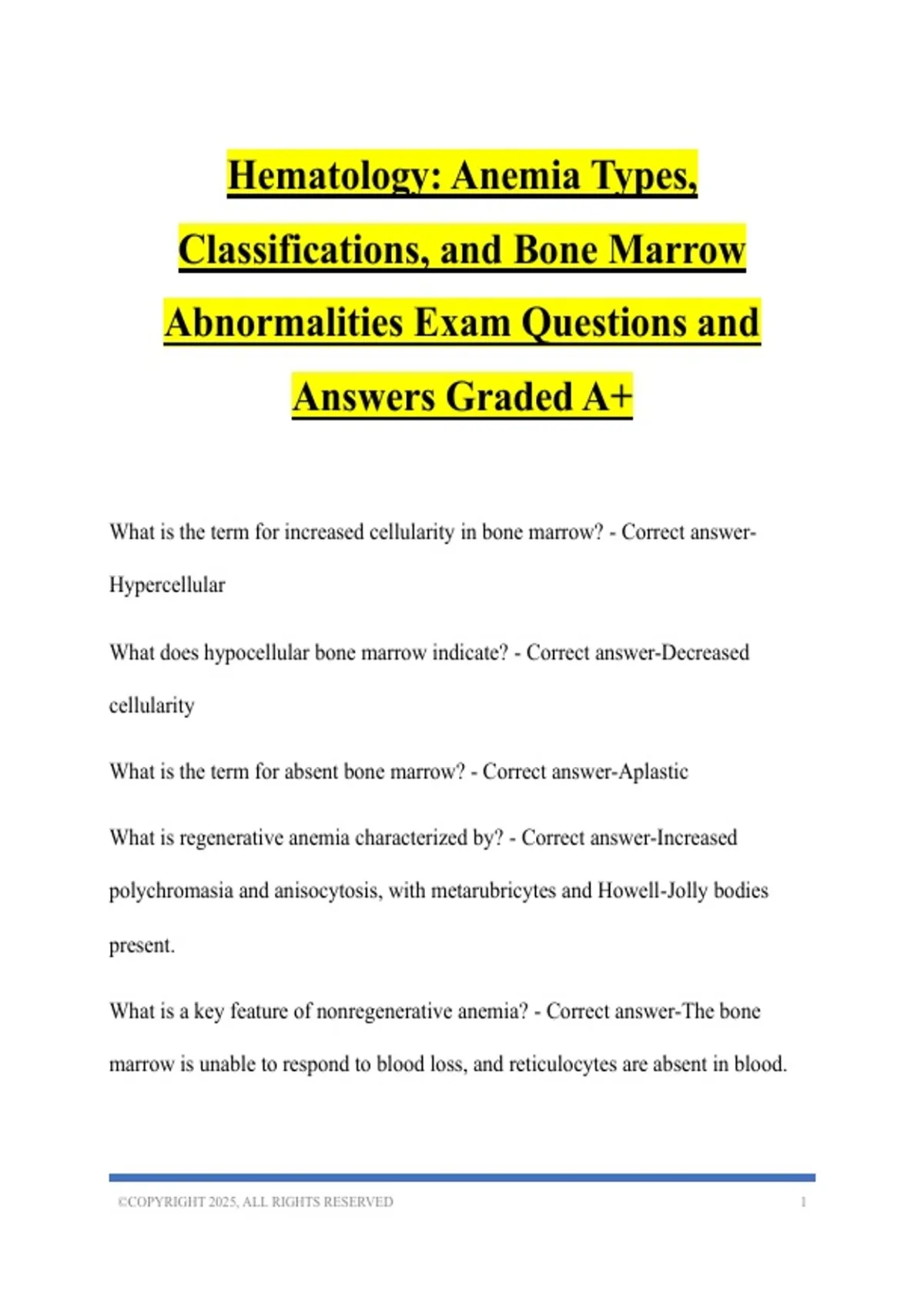 Hematology: Anemia Types, Classifications, and Bone Marrow Abnormalities Exam Questions and Answers Graded A+