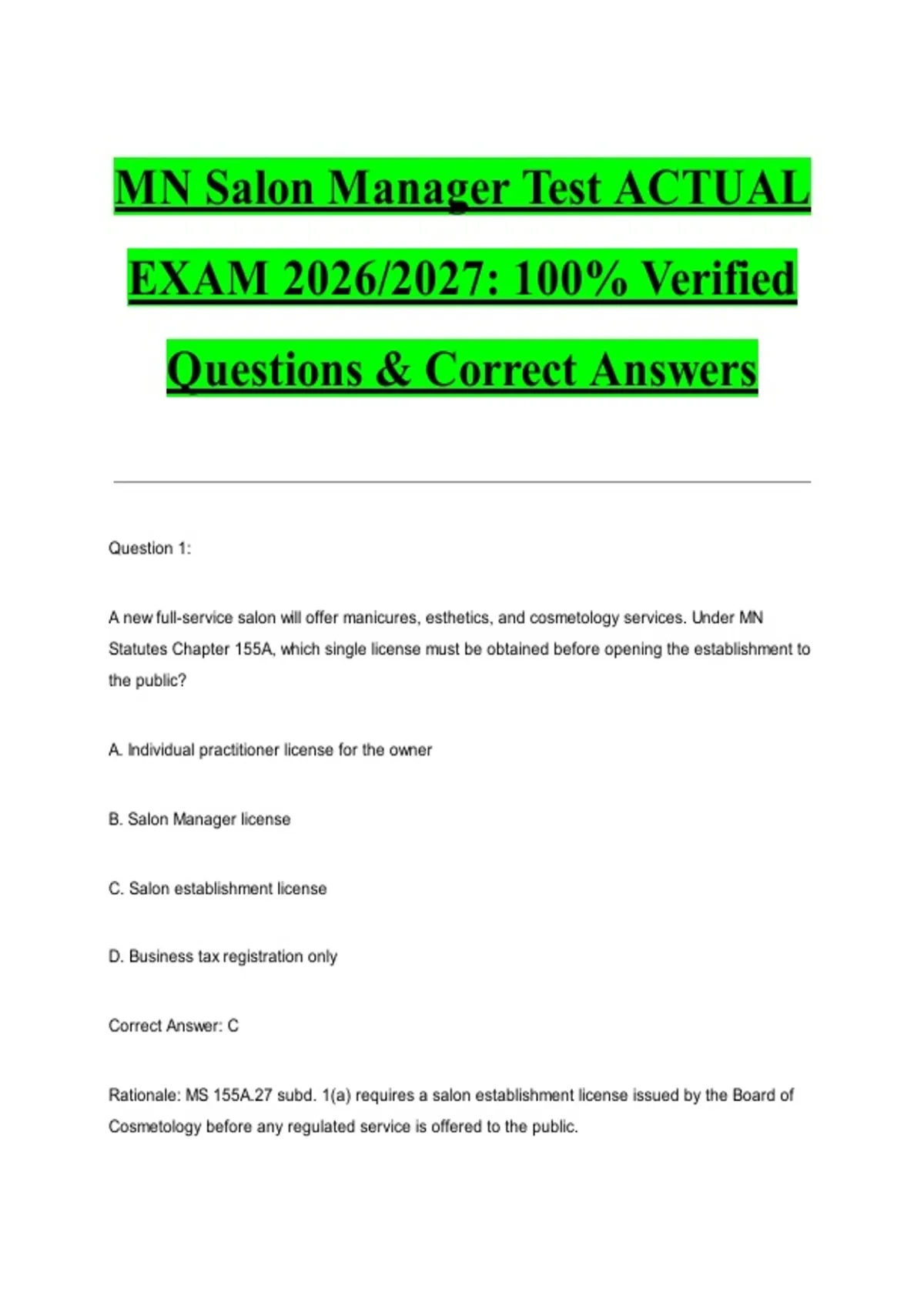 MN Salon Manager Test ACTUAL EXAM 2026/2027: 100% Verified Questions & Correct Answers