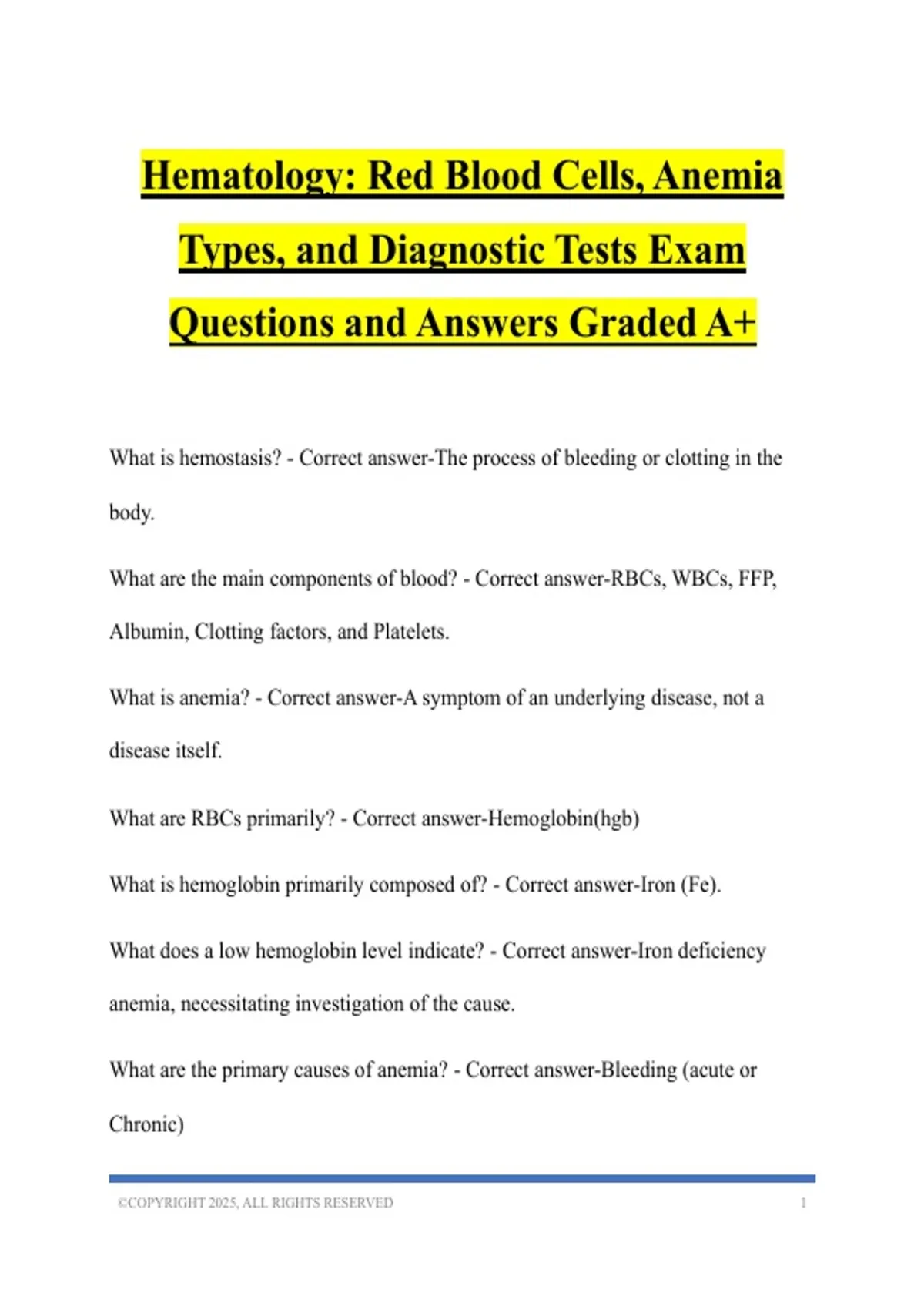 Hematology: Red Blood Cells, Anemia Types, and Diagnostic Tests Exam Questions and Answers Graded A+
