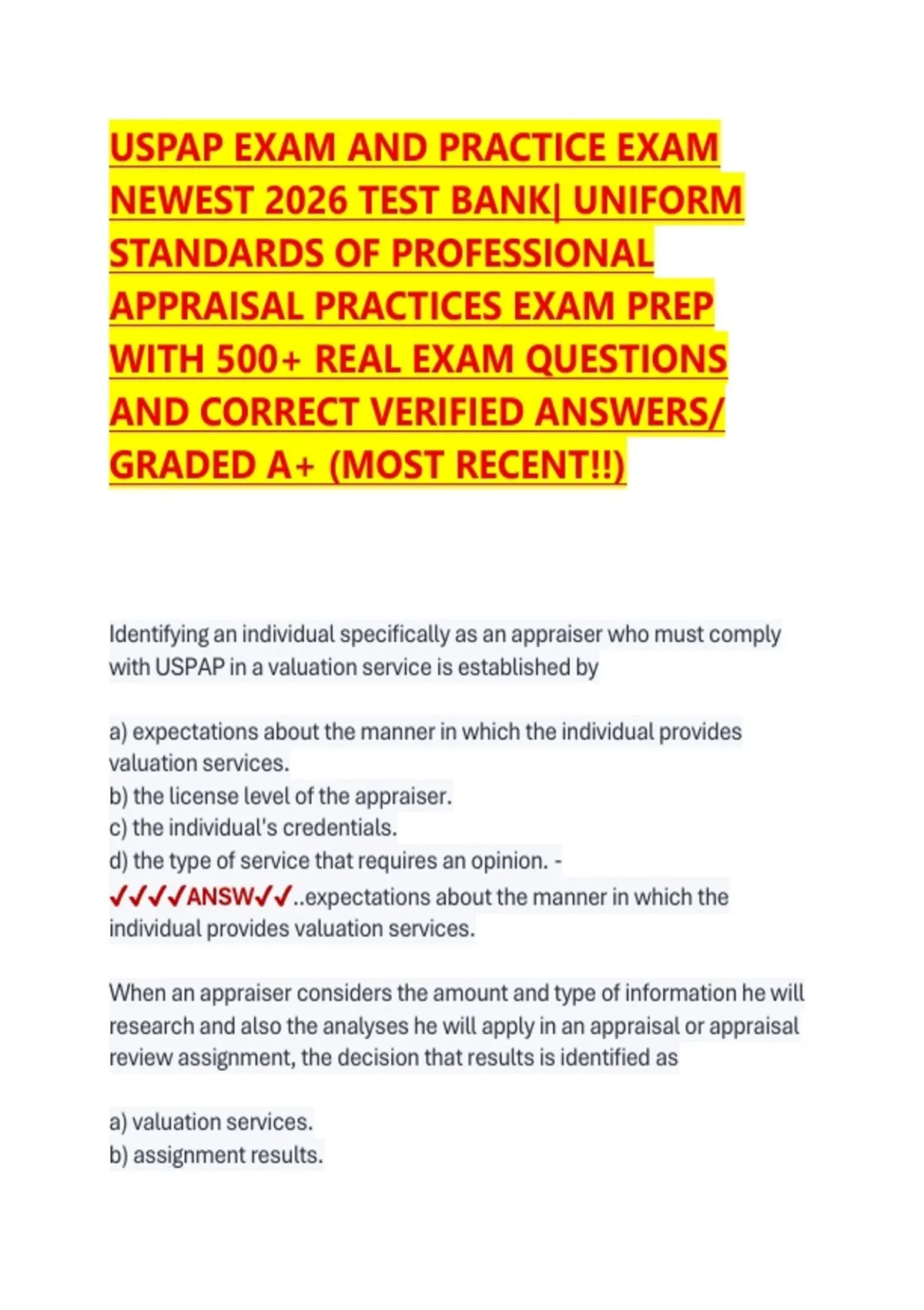 USPAP EXAM AND PRACTICE EXAM NEWEST 2026 TEST BANK| UNIFORM STANDARDS OF PROFESSIONAL APPRAISAL PRACTICES EXAM PREP WITH 500+ REAL EXAM QUESTIONS AND CORRECT VERIFIED ANSWERS/ GRADED A+ (MOST RECENT!!)