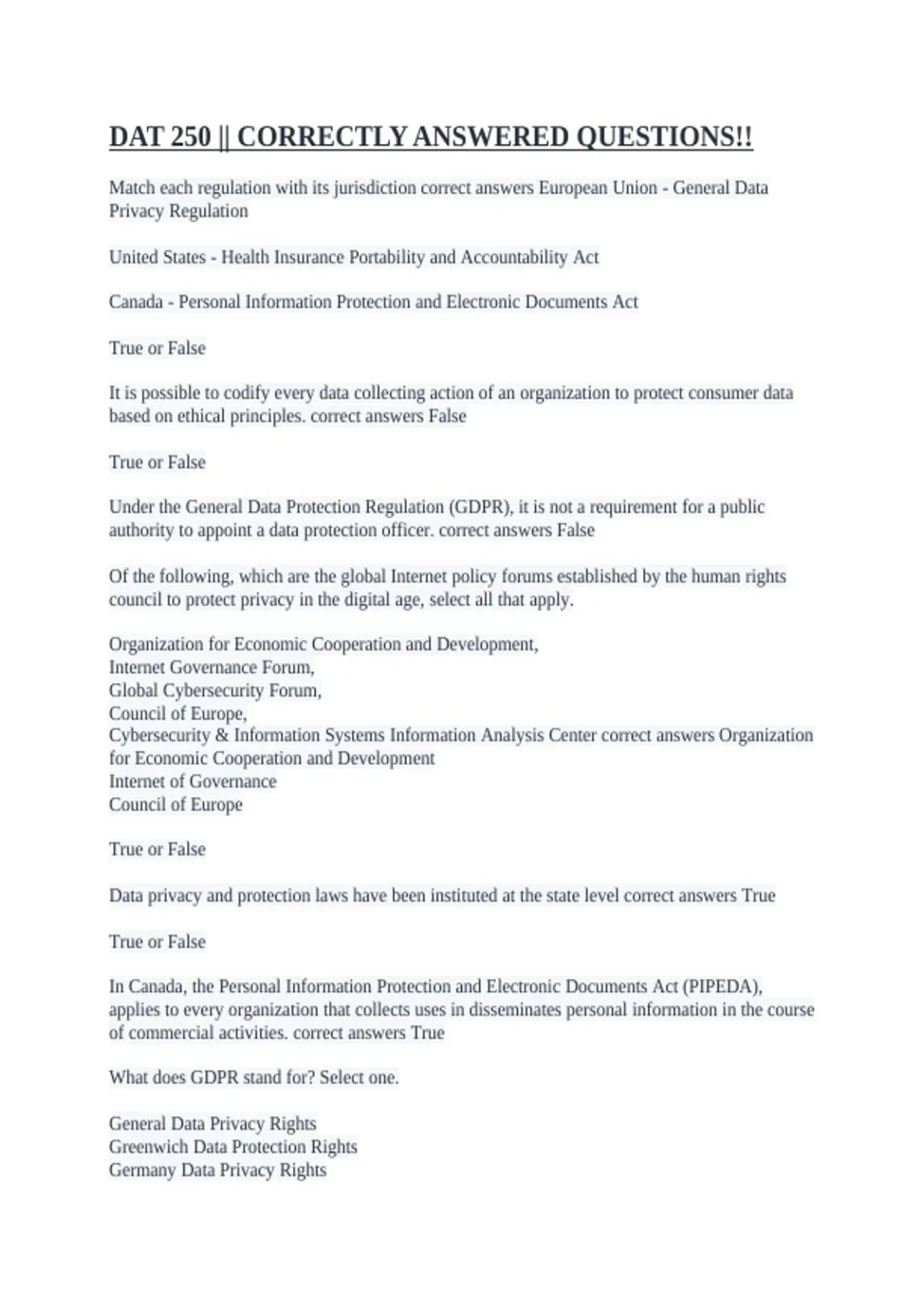DAT 250 || CORRECTLY ANSWERED QUESTIONS!!