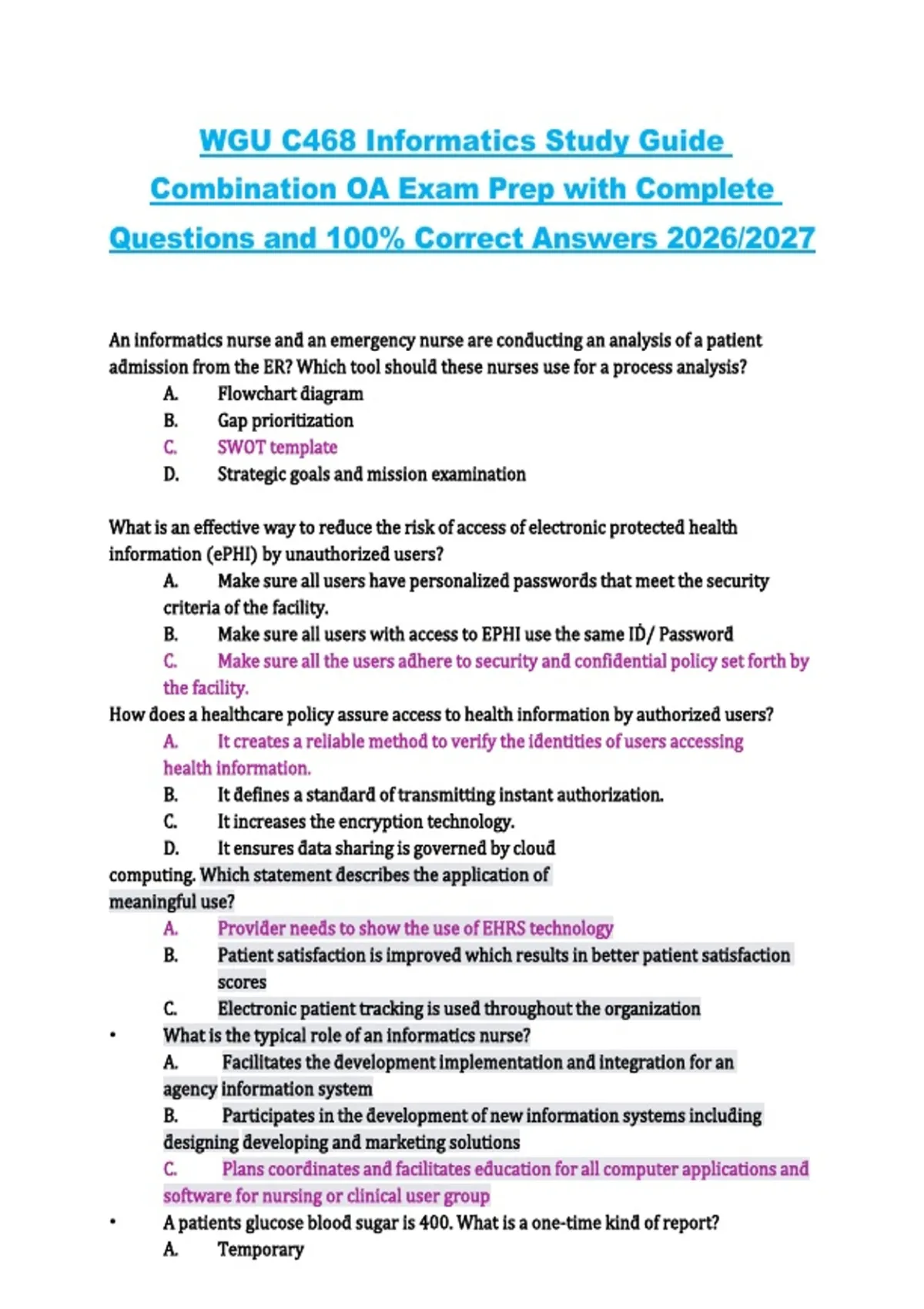 This study guide provides a comprehensive preparation resource for the C468 Informatics course at Western Governors University (WGU). It includes combination objective assessment (OA) exam questions with verified, correct answers covering core topics such as data management, health informatics, technology applications, information systems, and decision-making processes, aligned with the 2026/2027 curriculum. The guide is designed to support complete and effective exam readiness.