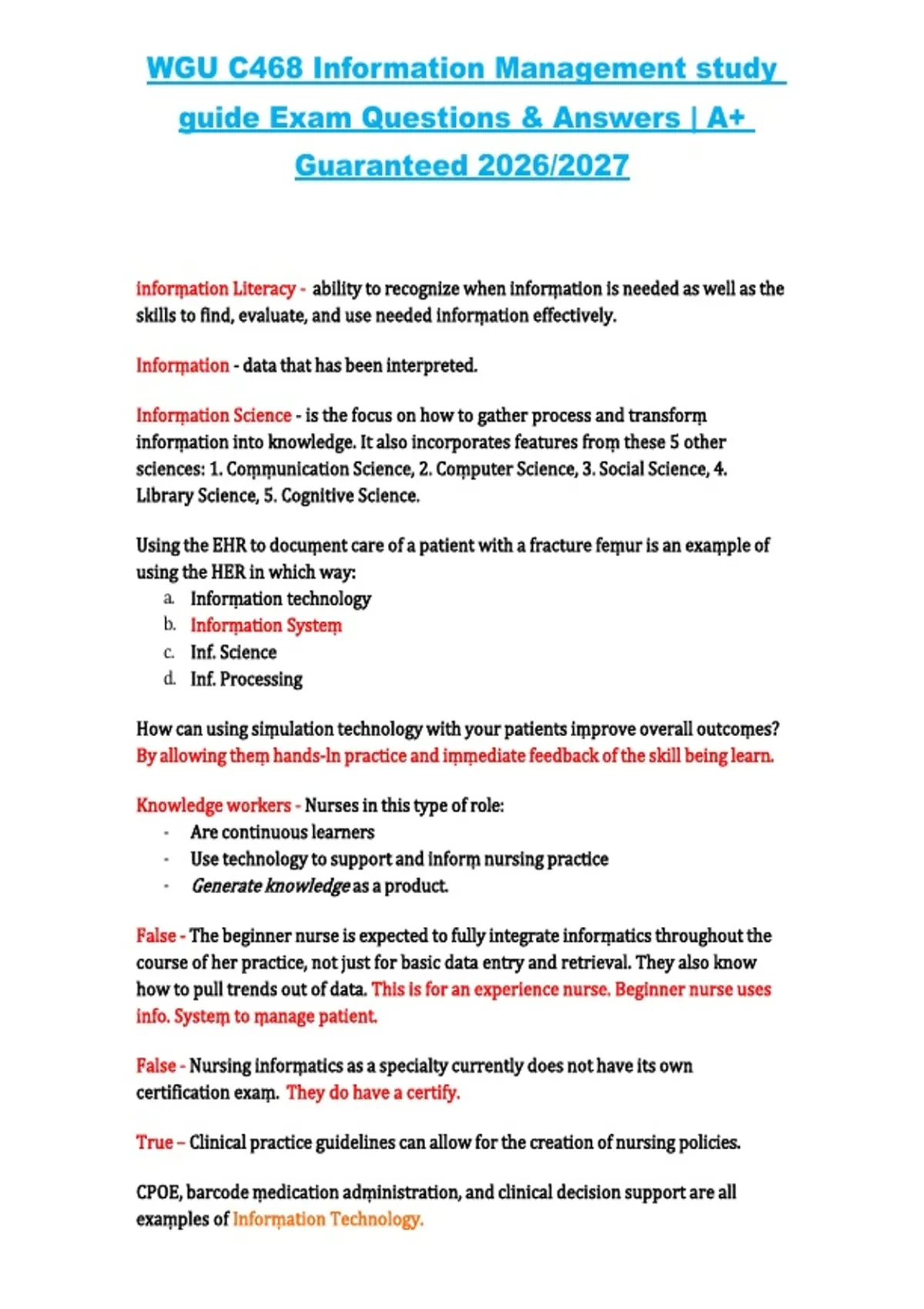 This study guide provides exam questions with verified, correct answers for C468 Information Management at Western Governors University (WGU). It covers essential course topics such as data management, information systems, technology applications, decision-making, and practical scenarios, aligned with the 2026/2027 curriculum. The material is designed to support effective exam preparation and mastery of all key concepts, with an A+ performance focus.