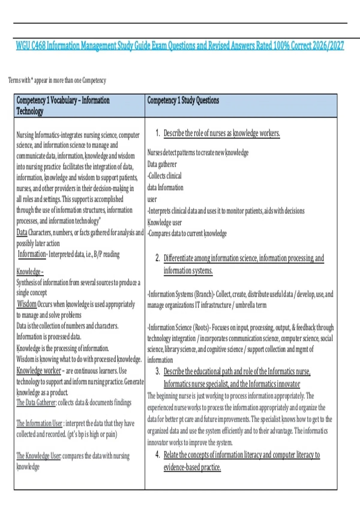 This study guide includes exam-style questions with revised, verified answers for C468 Information Management at Western Governors University (WGU). It covers core topics such as data management, information systems, technology application, decision-making processes, and practical scenarios, aligned with the 2026/2027 curriculum. The guide is designed to ensure thorough exam preparation with fully accurate solutions.