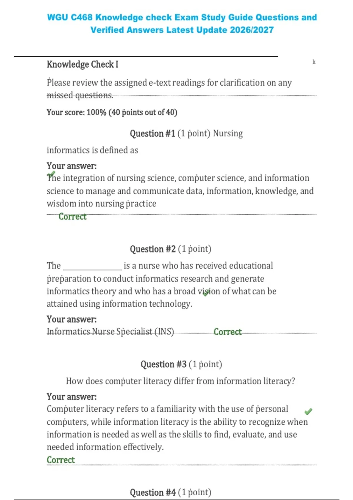 This study guide provides practice questions with verified, correct answers for the C468 Knowledge Check Exam at Western Governors University (WGU). It covers key topics including information management, data handling, technology application, decision-making processes, and practical scenarios, aligned with the latest 2026/2027 curriculum updates. The guide is designed to support effective exam preparation and mastery of core concepts.