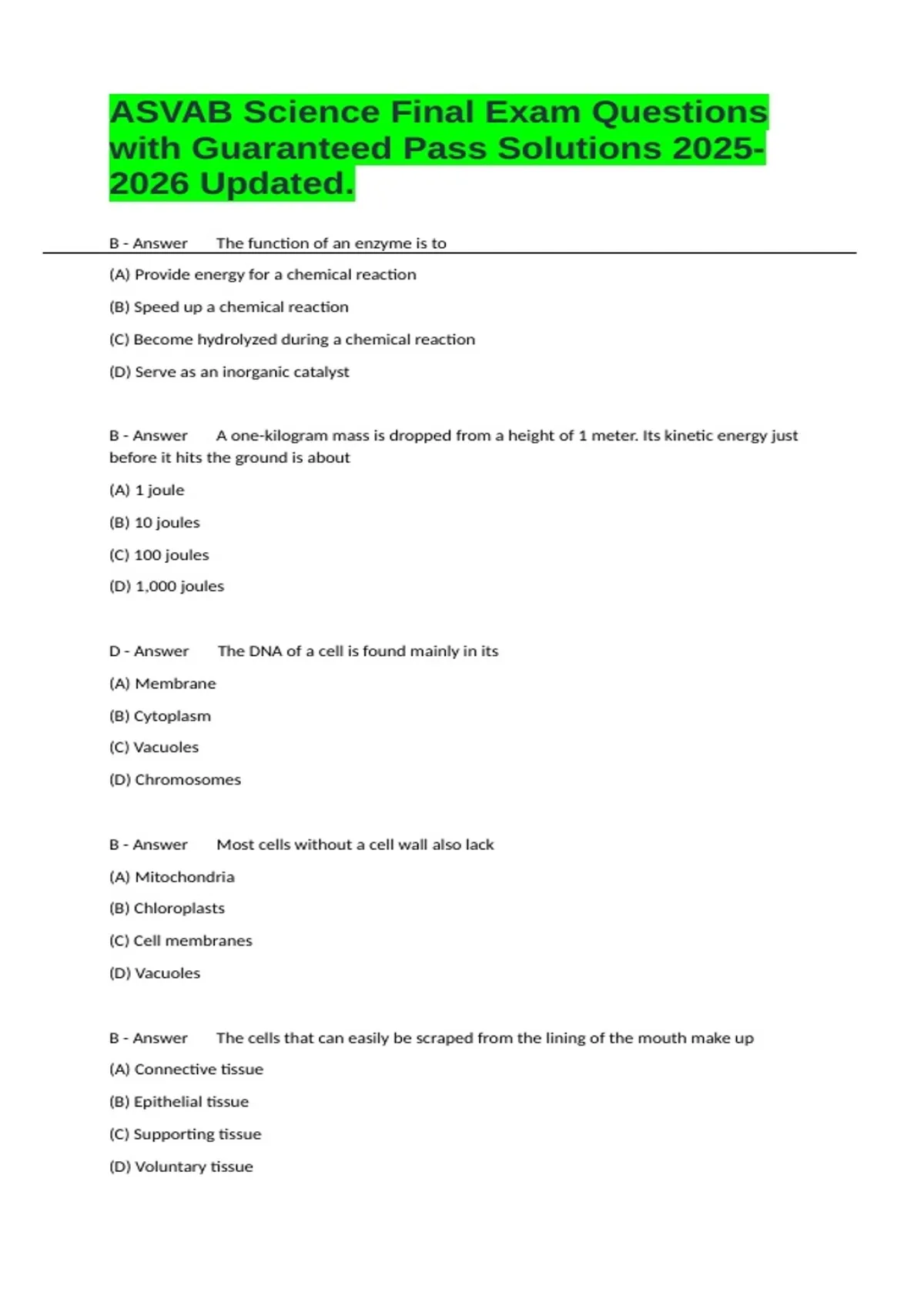 B - Answer The function of an enzyme is to (A) Provide energy for a chemical reaction (B) Speed up a chemical reaction (C) Become hydrolyzed during a chemical reaction (D) Serve as an inorganic catalyst B - Answer A one-kilogram mass is dropped from a height of 1 meter. Its kinetic energy just before it hits the ground is about (A) 1 joule (B) 10 joules (C) 100 joules (D) 1,000 joules D - Answer The DNA of a cell is found mainly in its (A) Membrane (B) Cytoplasm (C) Vacuoles (D) Chromosomes B - Answer Most cells without a cell wall also lack (A) Mitochondria (B) Chloroplasts (C) Cell membranes (D) Vacuoles B - Answer The cells that can easily be scraped from the lining of the mouth make up (A) Connective tissue (B) Epithelial tissue (C) Supporting tissue (D) Voluntary tissue
