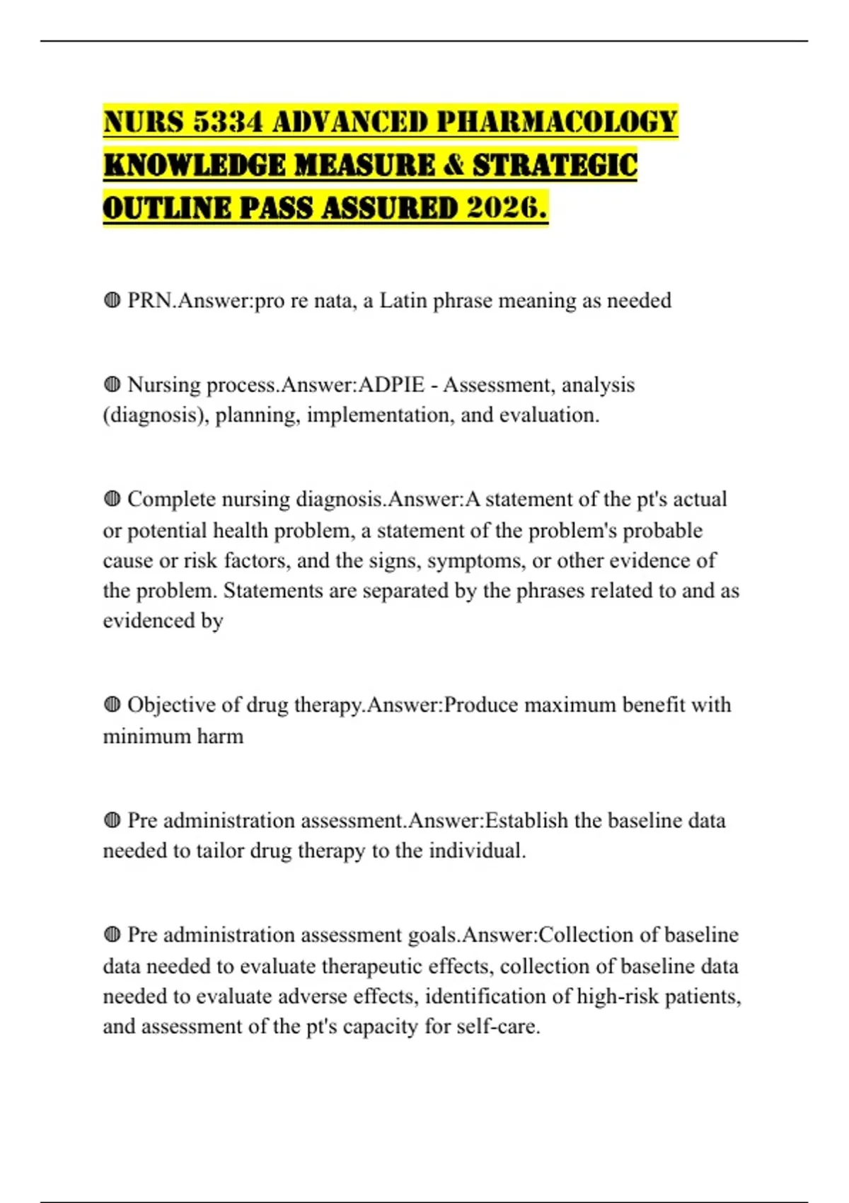 ◍ Pre administration assessment goals.Answer:Collection of baseline