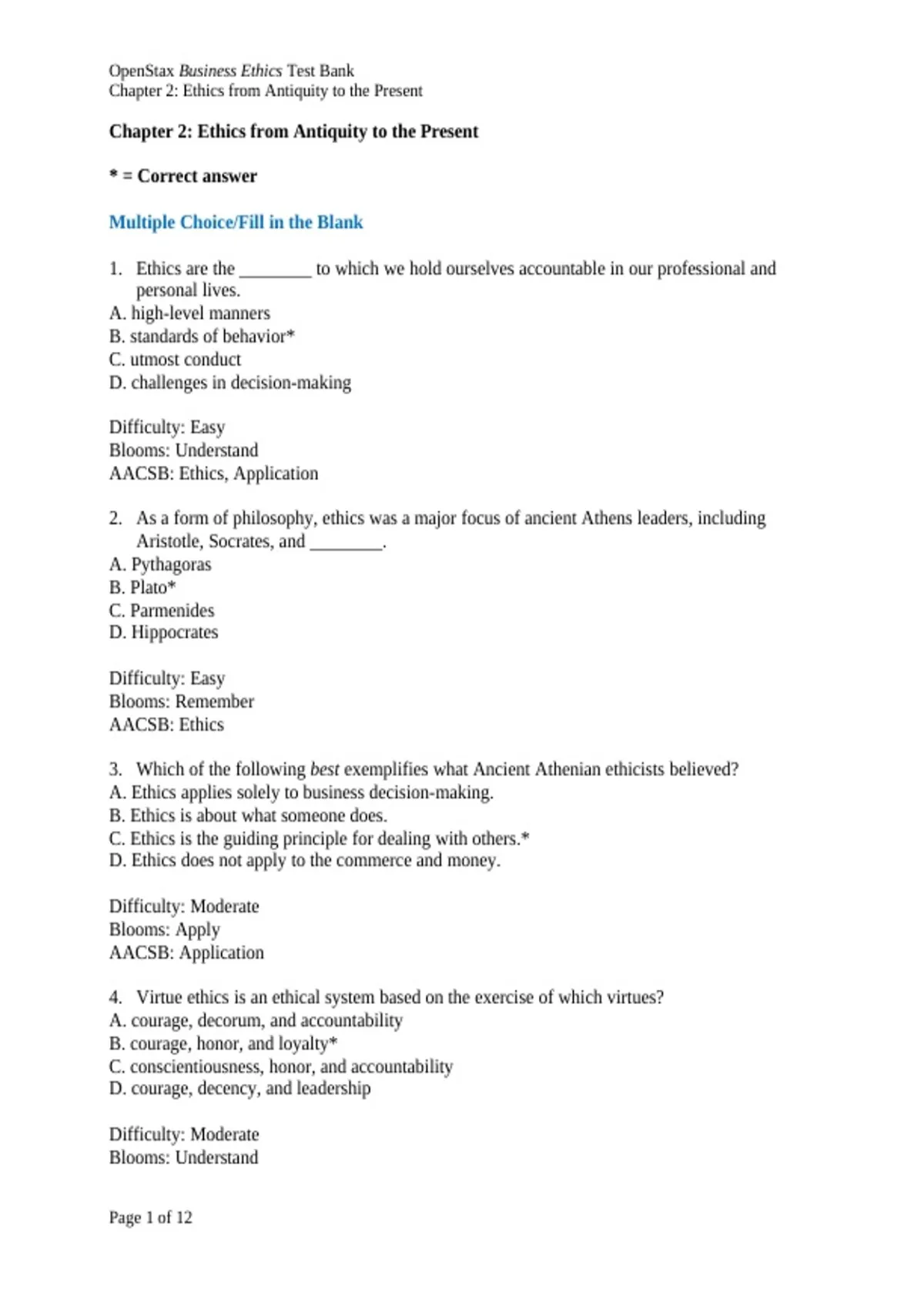 , OpenStax Business Ethics Test Bank