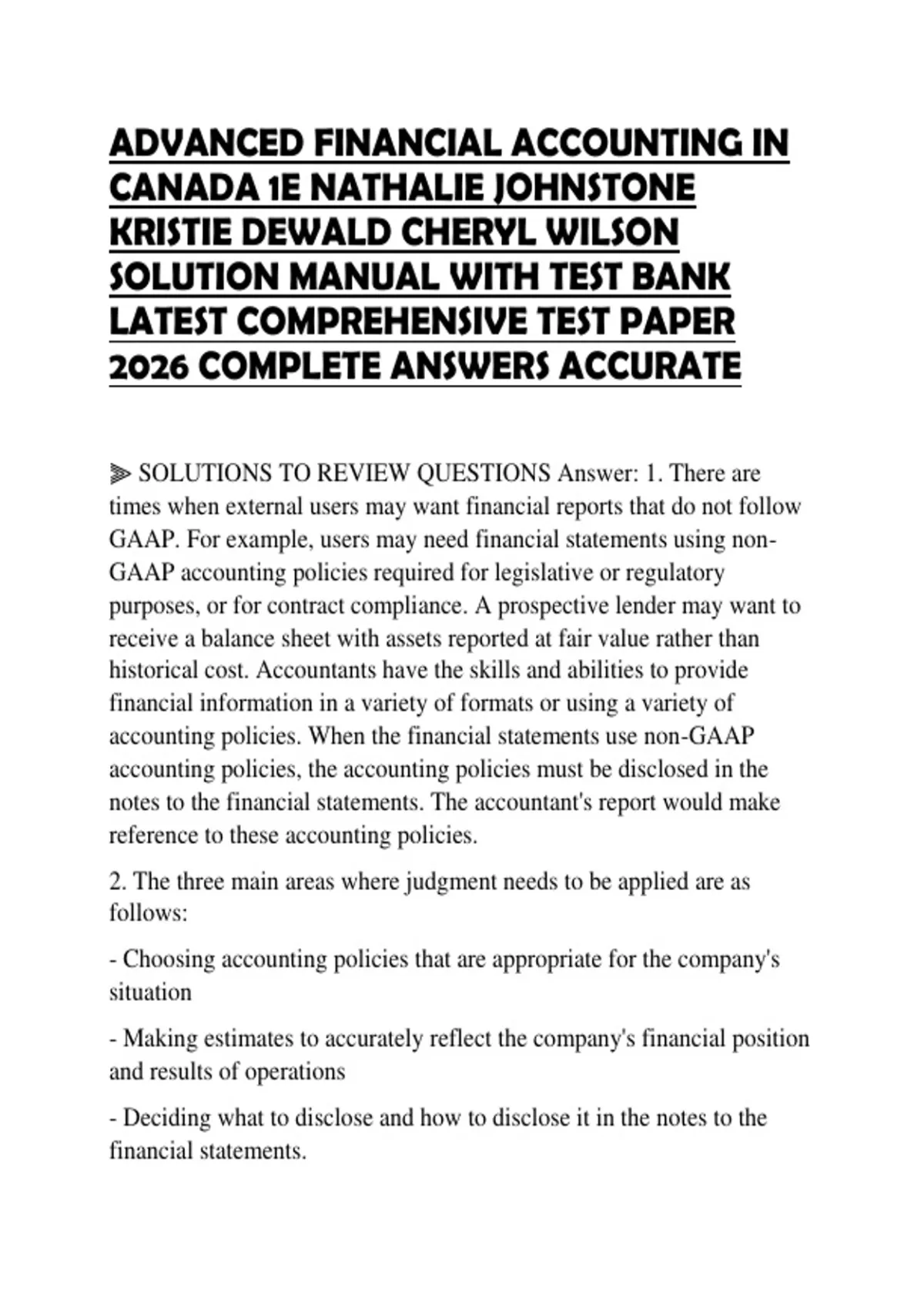 ADVANCED FINANCIAL ACCOUNTING IN CANADA 1E NATHALIE JOHNSTONE KRISTIE DEWALD CHERYL WILSON SOLUTION MANUAL WITH TEST BANK LATEST COMPREHENSIVE TEST PAPER 2026 COMPLETE ANSWERS ACCURATE