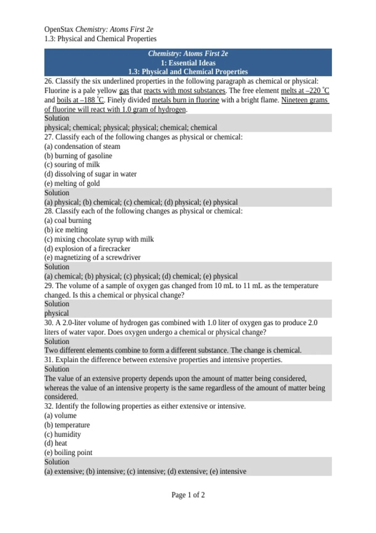 26. Classify the six underlined properties in the following paragraph as chemical or physical: