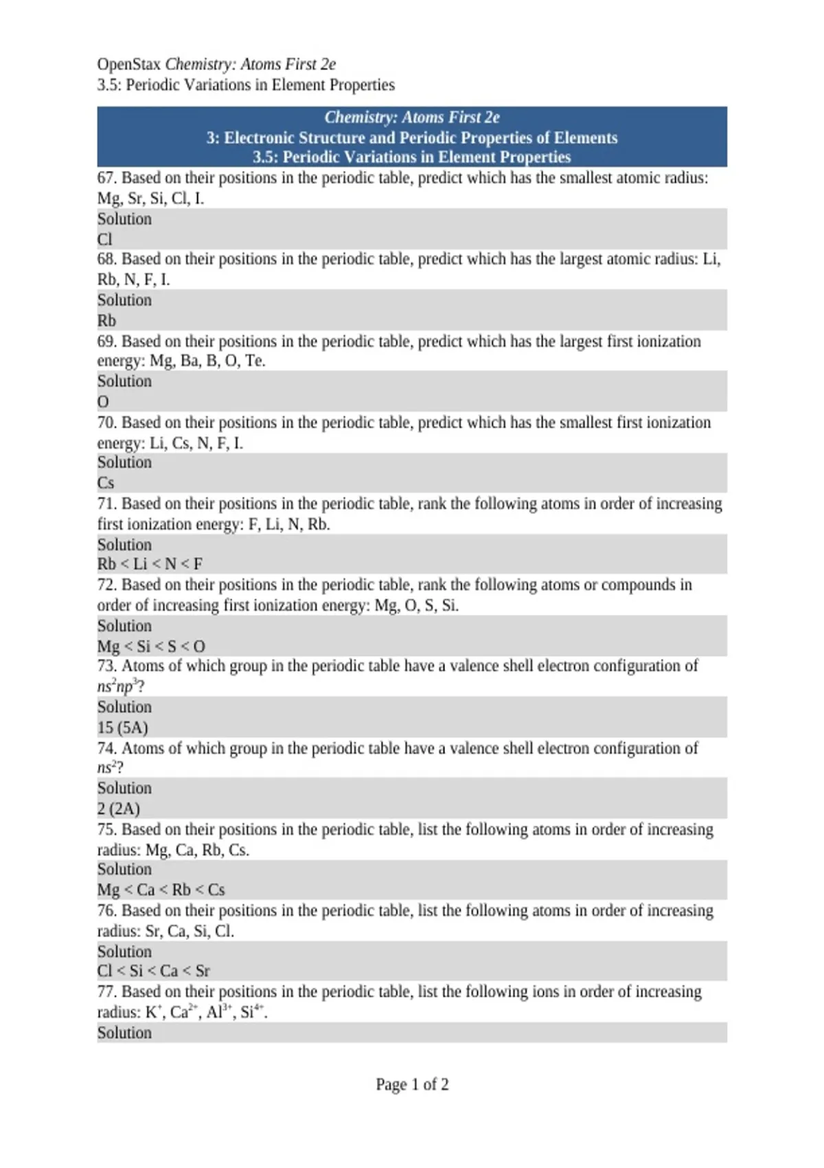 72. Based on their positions in the periodic table, rank the following atoms or compounds in