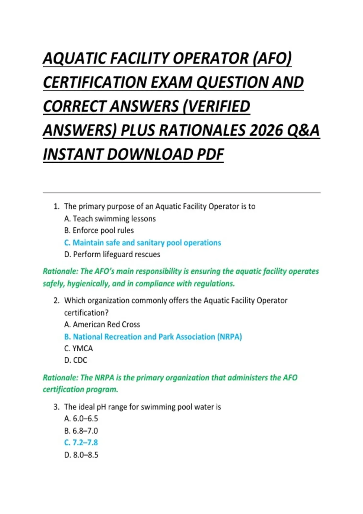 AQUATIC FACILITY OPERATOR (AFO) CERTIFICATION EXAM QUESTION AND CORRECT ANSWERS (VERIFIED ANSWERS) PLUS RATIONALES 2026 Q&A INSTANT DOWNLOAD PDF