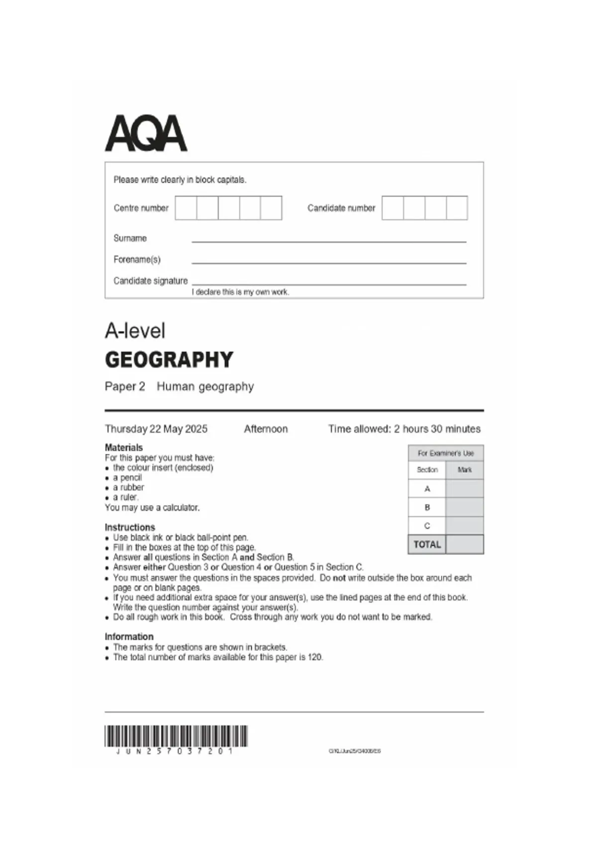 aqa a level geography 2025 exam Paper 1 & Paper 2 Including All Mark Schemes including paper 1,2 insert