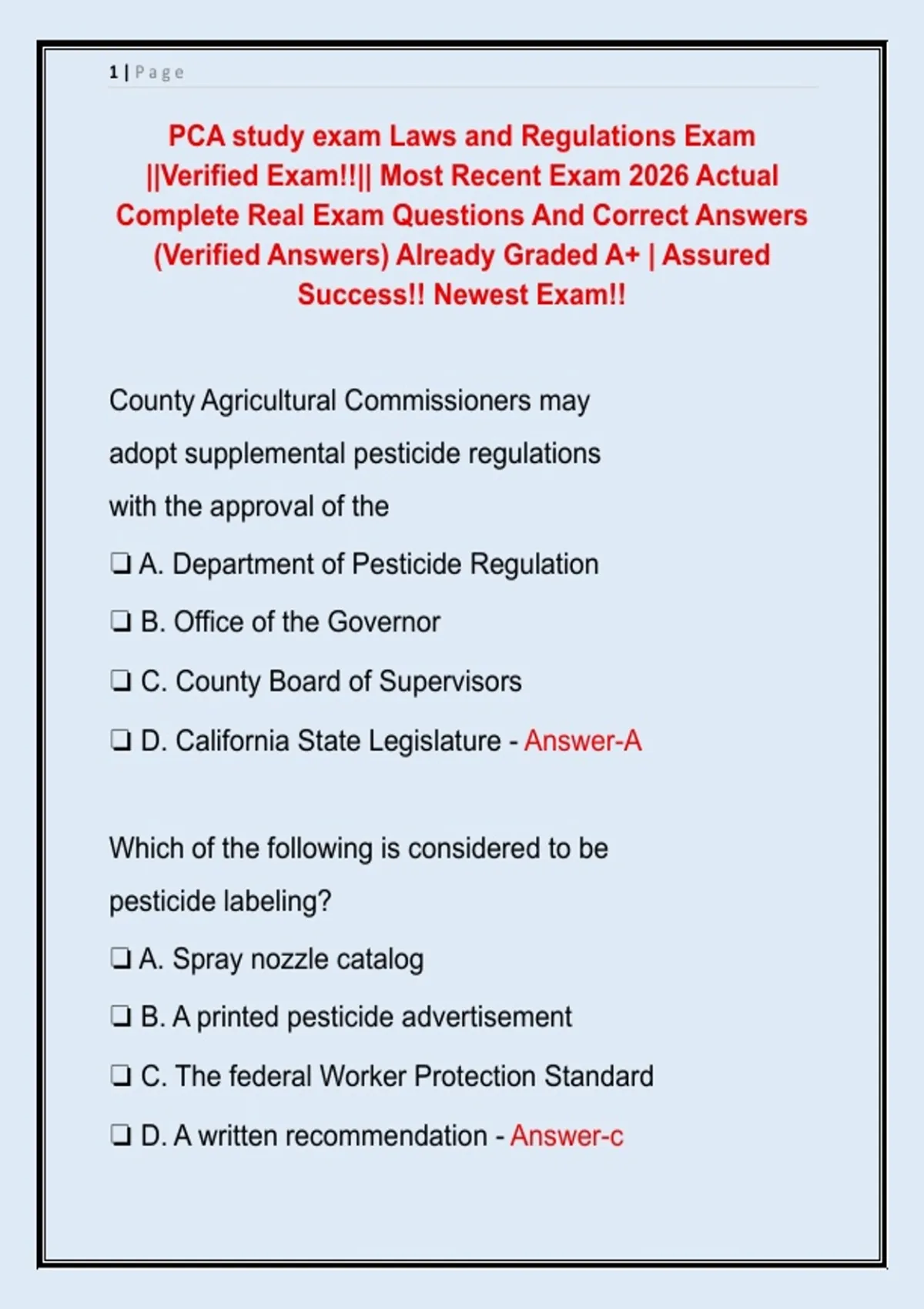 PCA study exam Laws and Regulations Exam ||Verified Exam!!|| Most Recent Exam 2026 Actual Complete Real Exam Questions And Correct Answers (Verified Answers) Already Graded A+ | Assured Success!! Newest Exam!!