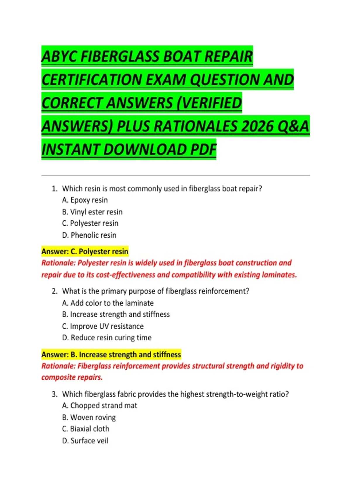ABYC FIBERGLASS BOAT REPAIR CERTIFICATION EXAM QUESTION AND CORRECT ANSWERS (VERIFIED ANSWERS) PLUS RATIONALES 2026 Q&A INSTANT DOWNLOAD PDF