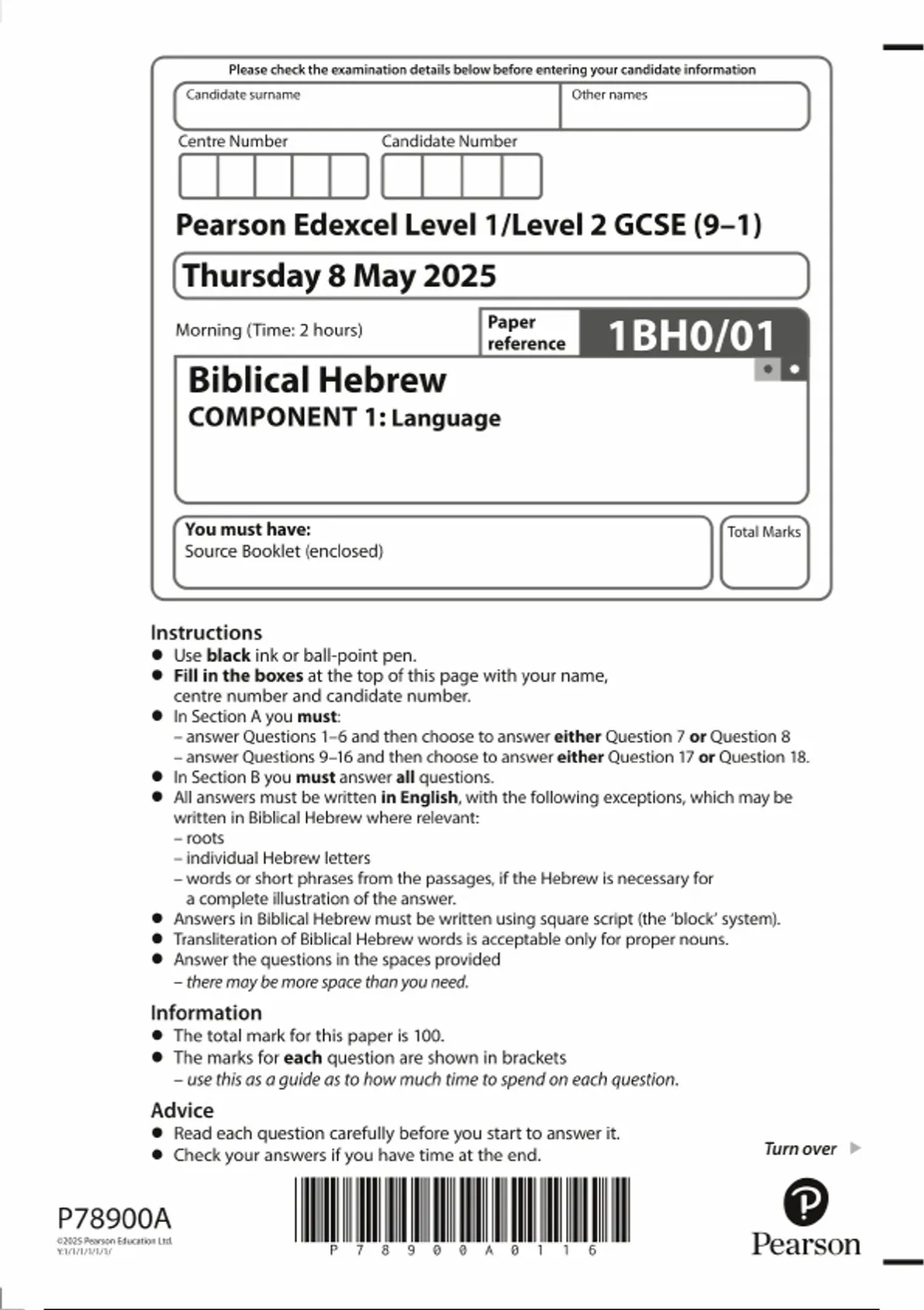 - 2025 Pearson Edexcel GCSE Biblical Hebrew PAPER 1