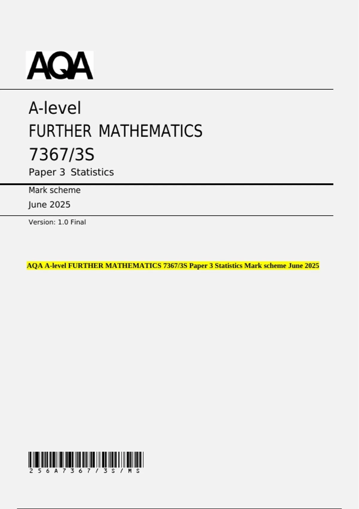 AQA A-level FURTHER MATHEMATICS 7367/3S Paper 3 Statistics Mark scheme June 2025