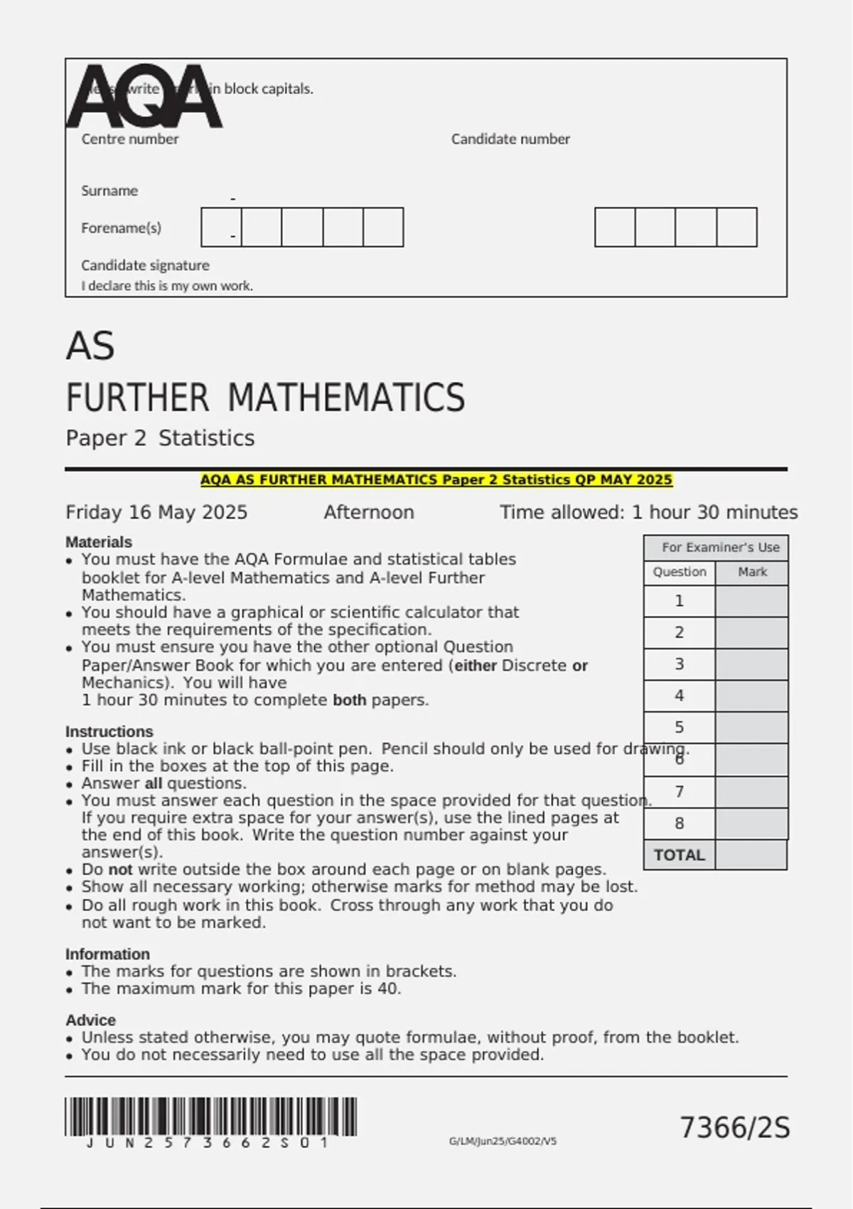 AQA AS FURTHER MATHEMATICS Paper 2 Statistics QP MAY 2025