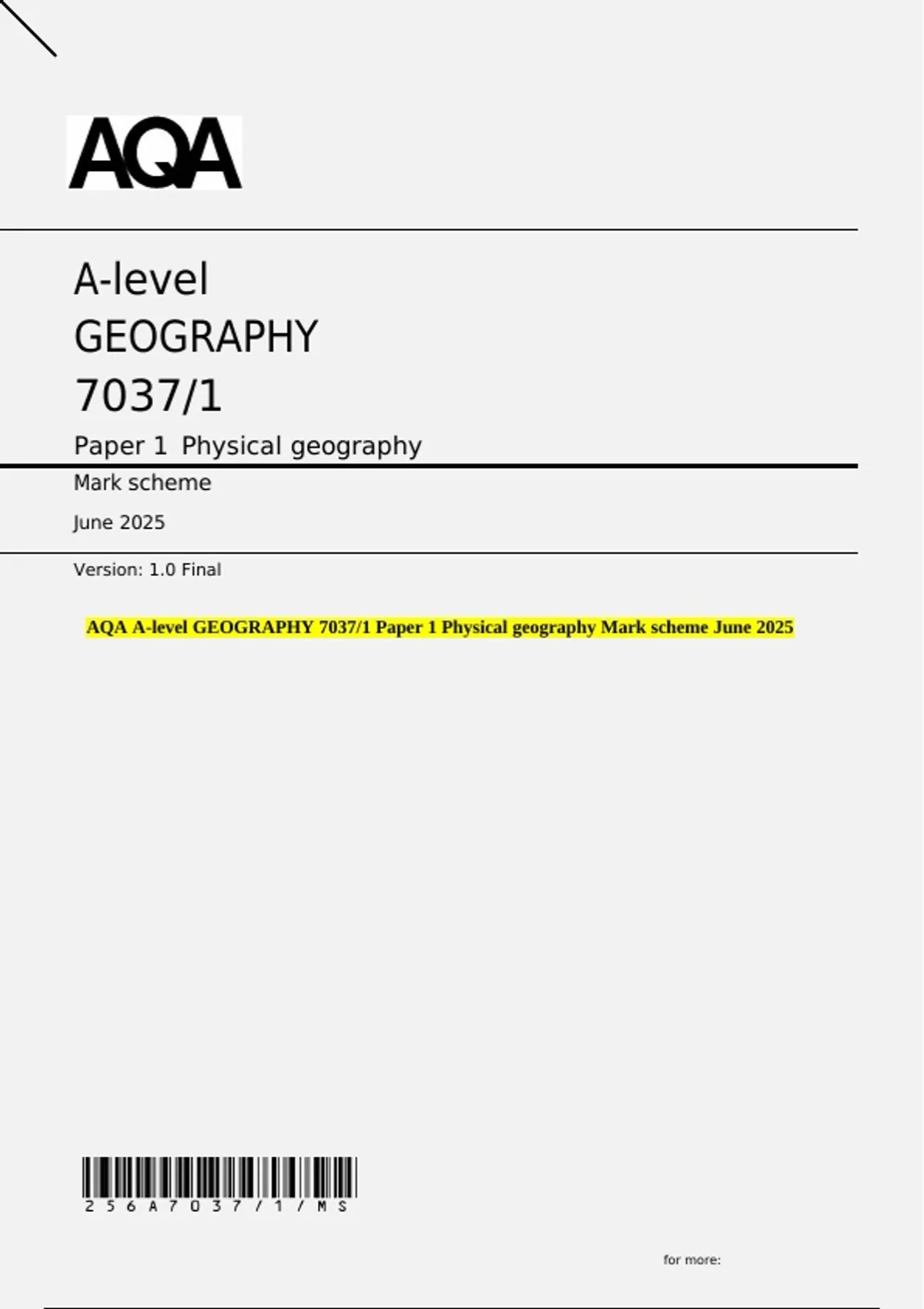 AQA A-level GEOGRAPHY 7037/1 Paper 1 Physical geography Mark scheme June 2025