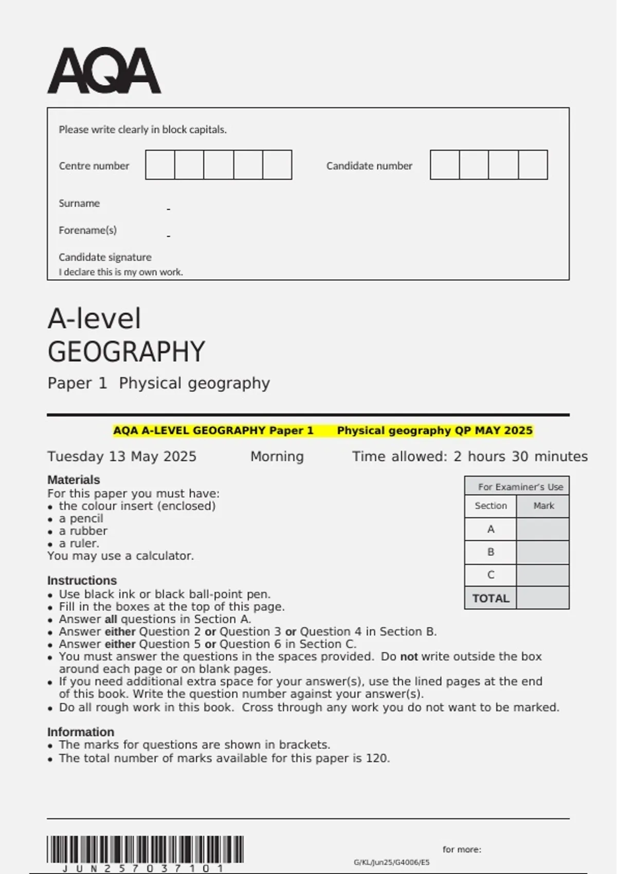 AQA A-LEVEL GEOGRAPHY Paper 1 Physical geography QP MAY 2025