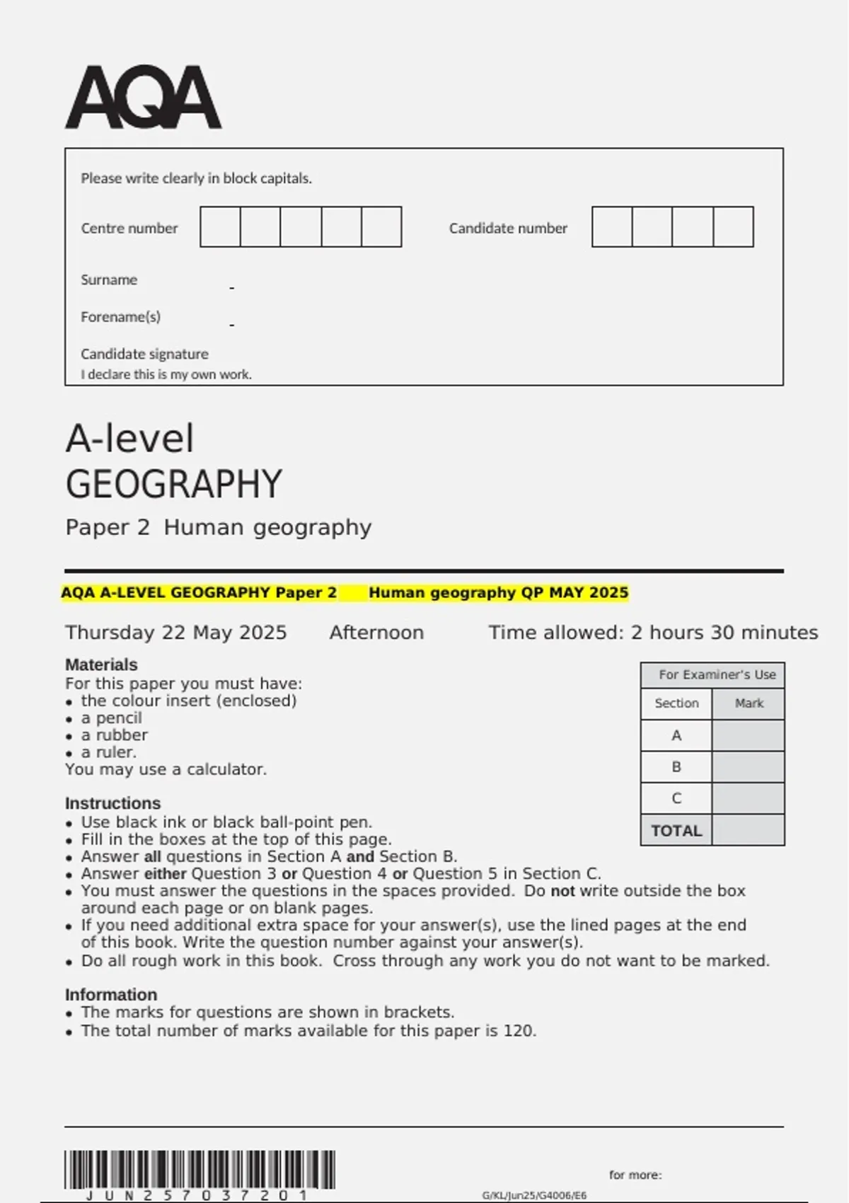AQA A-LEVEL GEOGRAPHY Paper 2 Human geography QP MAY 2025