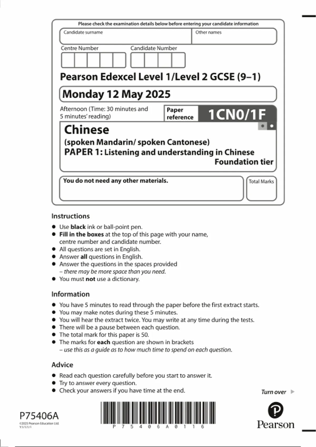2025 Pearson Edexcel GCSE Chinese Foundation tier PAPER 1 QUESTION PAPER 1CN0/1F :Listening and understanding in Chinese