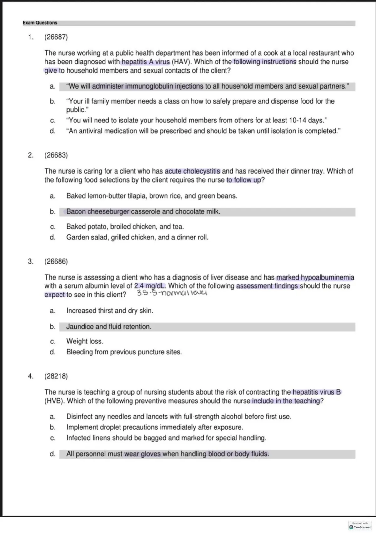 he nurse working at a public health department has been informed of a cook at a local restaurant who has been diagnosed with hepatitis A virus (HAV). Which of the following instructions should the nurse give to household members and sexual contacts of the client? a. “We will administer immunoglobulin injections to all household members and sexual partners.” b. “Your ill family member needs a class on how to safely prepare and dispense food for the public.” “You will need to isolate your household members from others for at least 10-14 days.” “An antiviral medication will be prescribed and should be taken until isolation is completed.” (26683) The nurse is caring for a client who has acute cholecystitis and has received their dinner tray. Which of the following food selections by the client requires the nurse to follow up? a Baked lemon-butter tilapia, brown rice, and green beans. b. Bacon cheeseburger casserole and chocolate milk.