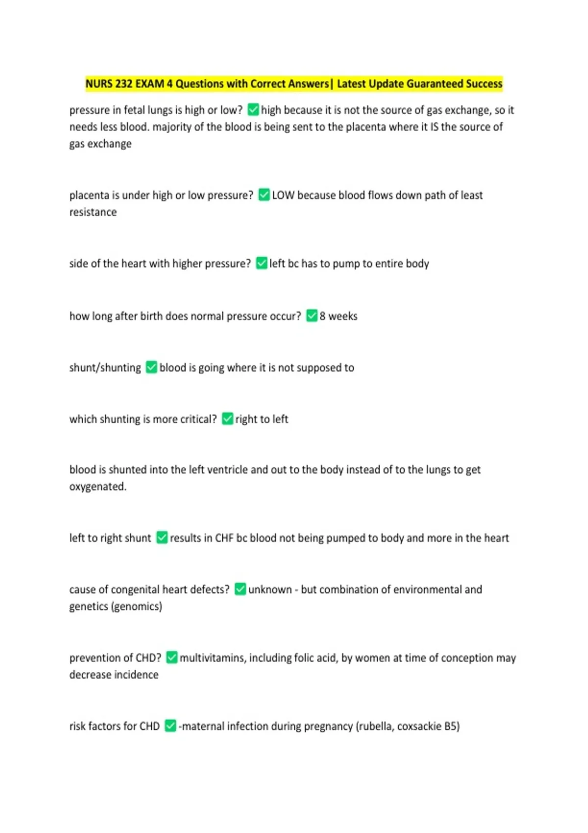 NURS 232 EXAM 4 Questions with Correct Answers| Latest Update Guaranteed Success