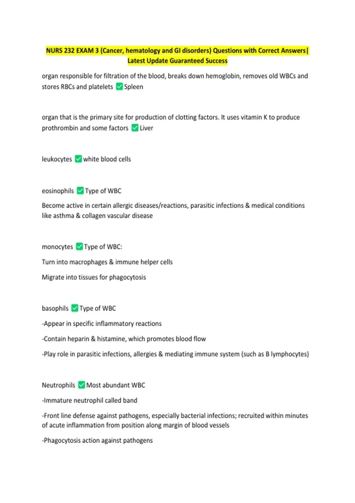 NURS 232 EXAM 3 (Cancer, hematology and GI disorders) Questions with Correct Answers|