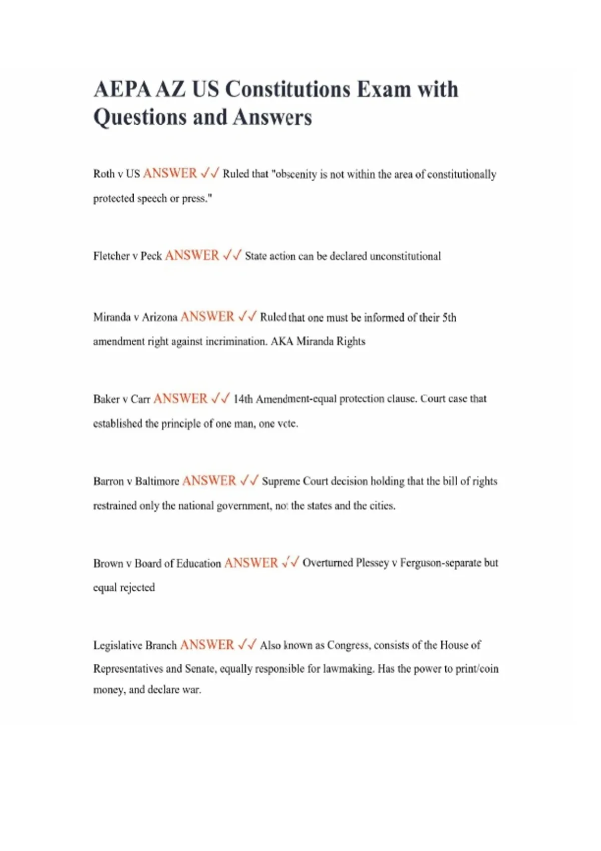 AEPA AZ US Constitutions Exam with Questions and Answers Roth v US ANSWER Ruled that "obscenity is not within the area of constitutionally protected speech or press." Fletcher v Peck ANSWER State action can be declared unconstitutional Miranda v Arizona ANSWER Ruled that one must be informed of their 5th amendment right against incrimination. AKA Miranda Rights Baker v Carr ANSWER 14th Amendment-equal protection clause. Court case that established the principle of one man, one vote. Barron v Baltimore ANSWER Supreme Court decision holding that the bill of rights restrained only the national government, not the states and the cities. Brown v Board of Education ANSWER Overturned Plessey v Ferguson-separate but equal rejected Legislative Branch ANSWER Also known as Congress, consists of the House of Representatives and Senate, equally responsible for lawmaking. Has the power to print/coin money, and declare war. Congressional Record ANSWER Publication of all the business transactions of the US Congress Ratification ANSWER Subsequent approval for a bill that has been altered or changed, decided by the congress