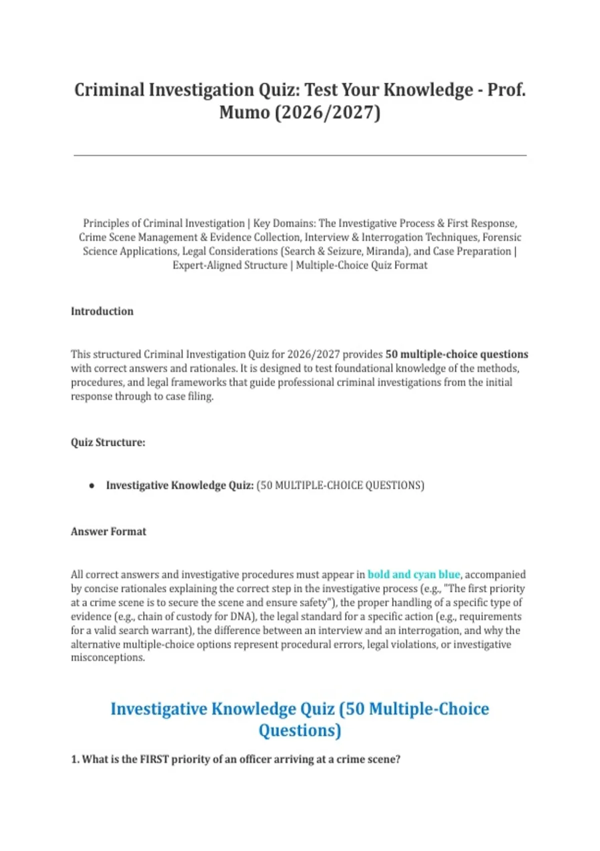 This structured Criminal Investigation Quiz for 2026/2027 provides 50 multiple-choice questions