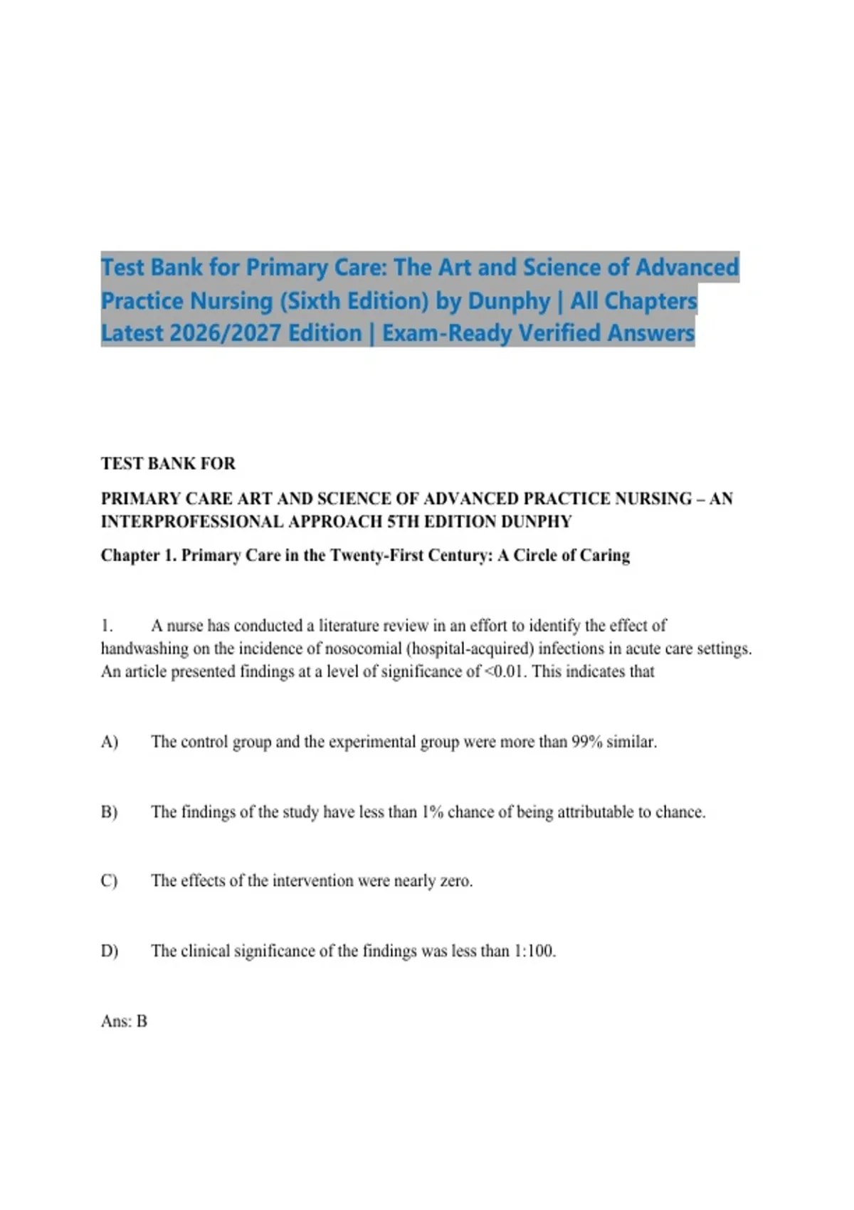 This document provides a comprehensive test bank for Primary Care: The Art and Science of Advanced Practice Nursing Sixth Edition by Dunphy, covering all chapters in the textbook. It includes exam-style questions with carefully reviewed answers aligned with advanced practice nursing competencies and primary care guidelines. The material is updated for the 2026/2027 academic year and is designed to support nurse practitioner students with exam preparation, clinical reasoning, and course mastery.