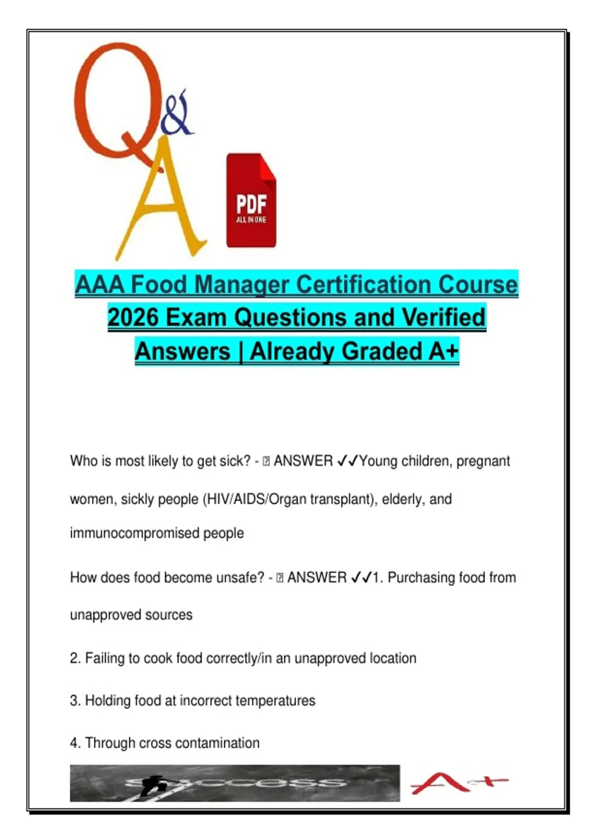 This document offers 130 verified and graded A+ multiple-choice questions with correct answers, curated for the AAA Food Manager Certification Course 2026. It provides a comprehensive review of key topics in food safety, with a strong focus on real-world application, health regulations, and scientifically backed foodborne illness prevention strategies. The content is ideal for both exam prep and food safety mastery. Major subjects include: High-risk populations and how food becomes unsafe Types of contamination: biological, chemical, physical, and cross-contamination Foodborne pathogens and toxins: E. coli, Salmonella, Shigella, Norovirus, Hepatitis A, Listeria, Trichinella, Giardia, Anisakis, and more Spoilage organisms: mold, yeast, fungi, and their growth conditions Food poisoning types: infection vs. intoxication FDA’s Big 6 and employee illness protocols Regulatory bodies: FDA, CDC, USDA, Local Health Department – and their distinct responsibilities HACCP principles and FAT TOM conditions for bacterial growth Safe food handling, storage temperatures, personal hygiene, and illness exclusions Cleaning procedures, food recalls, and customer complaint handling Each answer is clearly marked, ensuring students and professionals can reinforce correct knowledge efficiently. Definitions, symptoms, transmission routes, and preventive measures are explained in detail, making this more than just a question bank—it’s a learning tool. Ideal for: Students in Public Health, Hospitality, Culinary Arts, Environmental Health, and Food Science Individuals preparing for AAA Food Manager Certification, ServSafe Manager, or CPFM exams Food safety trainers and supervisors responsible for regulatory compliance and certification prep Restaurant managers, institutional kitchen staff, and food service workers This resource is especially valuable for those working with high-risk populations or handling TCS foods. Keywords: foodborne illness, pathogens, TCS food, food contamination, HACCP, Big 6, food infection, food intoxication, FDA, CDC, USDA, food safety certification, temperature danger zone, allergens, cross-contamination, hygiene protocol, FAT TOM, safe food handling, parasites, spores, toxins, food recall