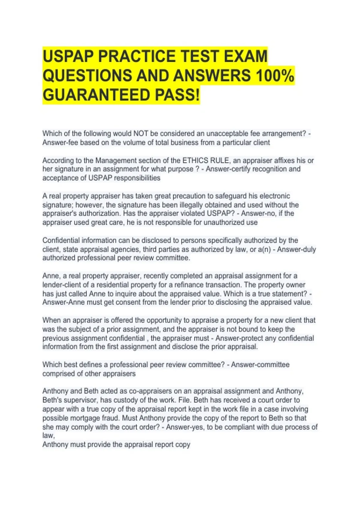 USPAP PRACTICE TEST QUESTIONS AND ANSWERS 100% GUARANTEED PASS!