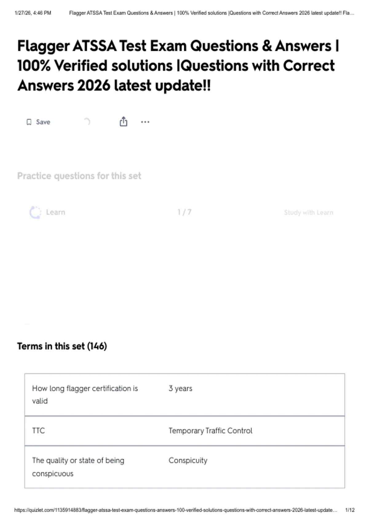 , 1/27/26, 4:46 PM Flagger ATSSA Test Exam Questions & Answers | 100% Verified solutions |Questions with Correct Answers 2026 latest update!! Fla…